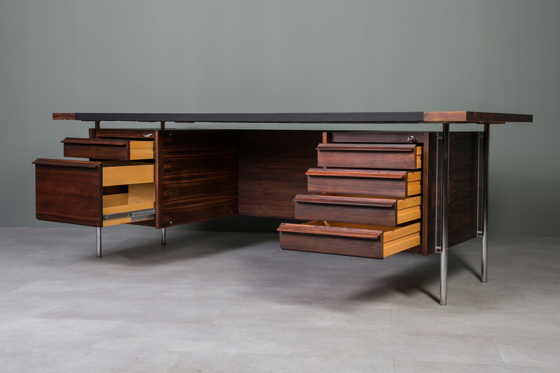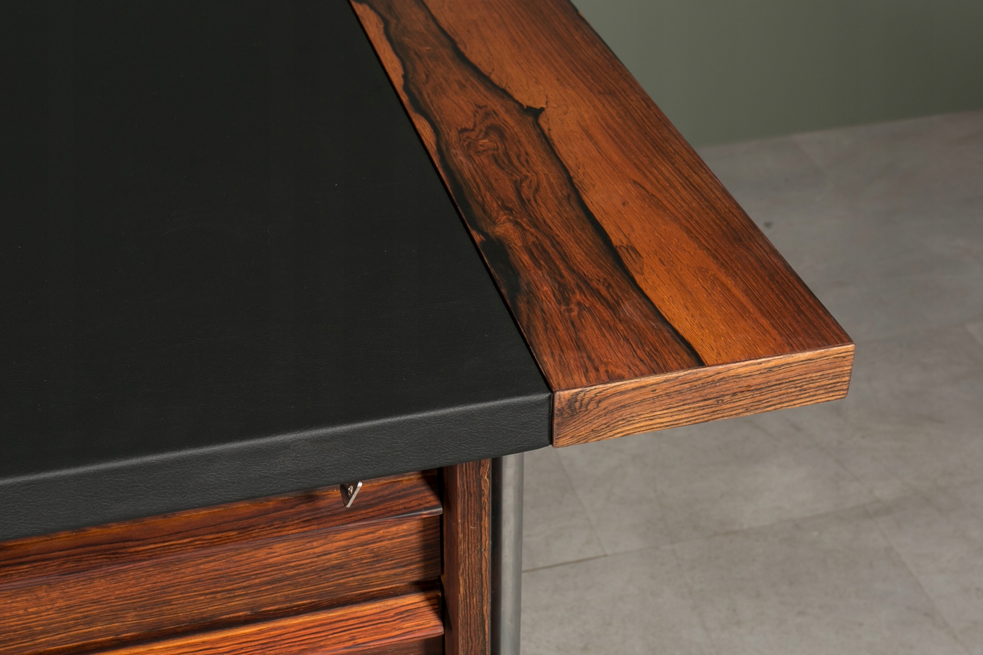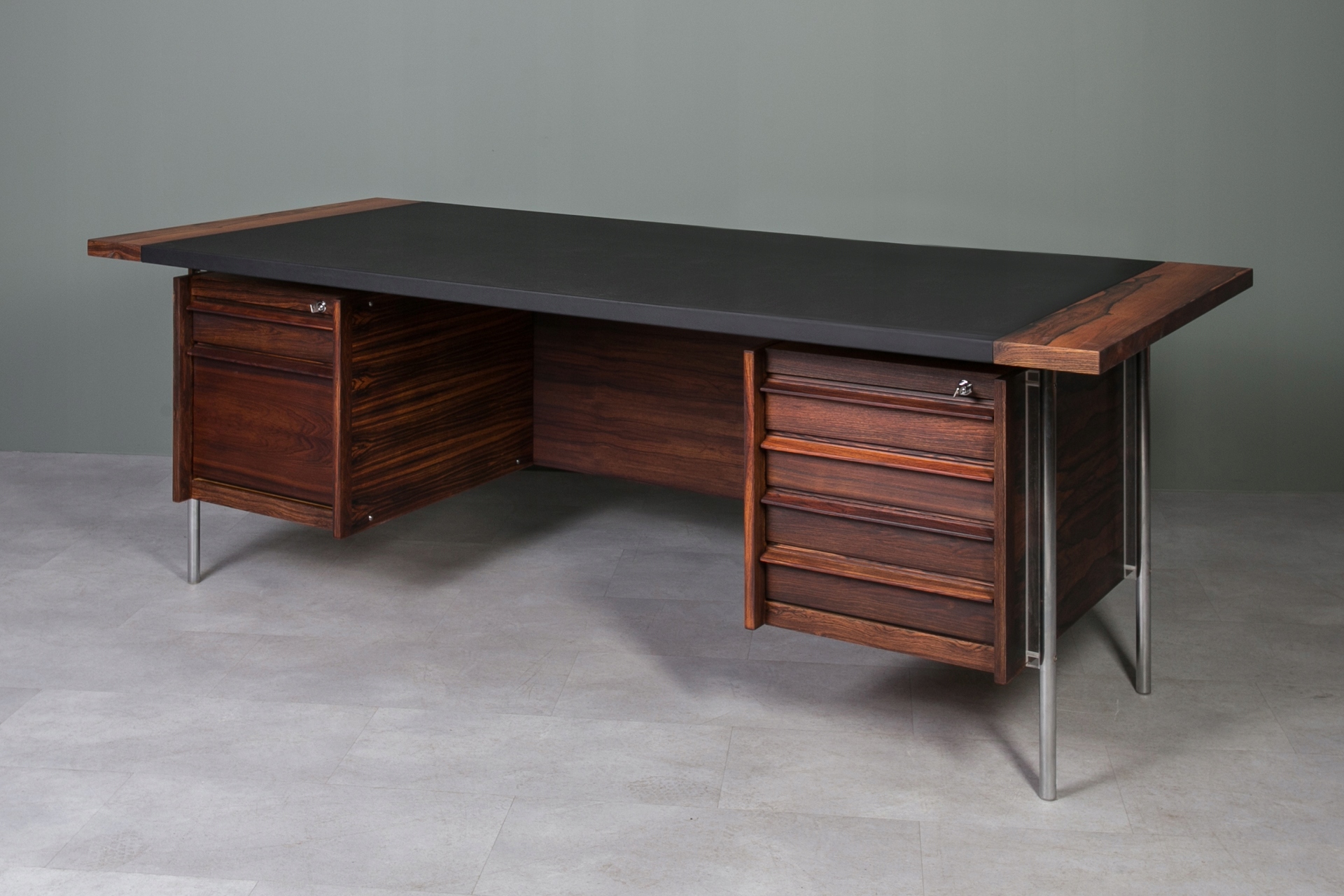 Уникальный проект норвежского дизайнера, который стал символом современного стиля середины века. Стол был сделан из высококачественного палисандру, характеризующегося красивым рисунком из дерева, в сочетании с верхней частью, отделанной с элегантной черной кожей. Стальные ножки добавляют легкость всей конструкции, создавая гармоничное сочетание натуральных и промышленных материалов