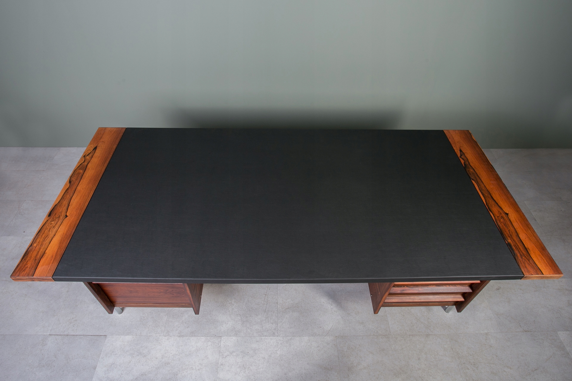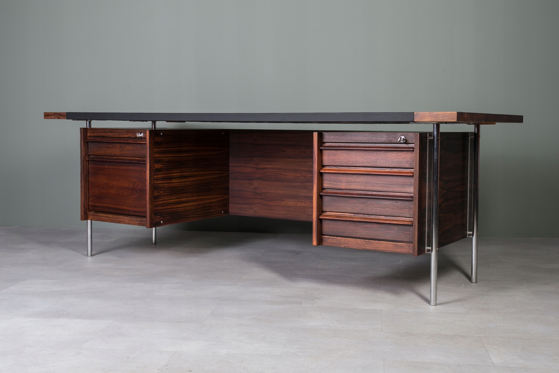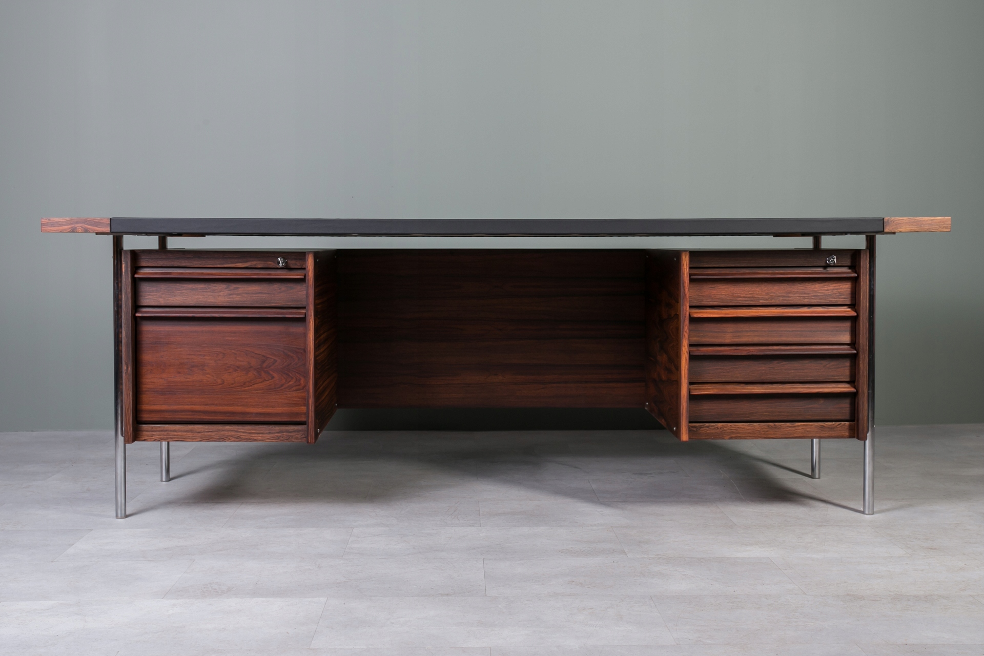 Уникальный проект норвежского дизайнера, который стал символом современного стиля середины века. Стол был сделан из высококачественного палисандру, характеризующегося красивым рисунком из дерева, в сочетании с верхней частью, отделанной с элегантной черной кожей. Стальные ножки добавляют легкость всей конструкции, создавая гармоничное сочетание натуральных и промышленных материалов