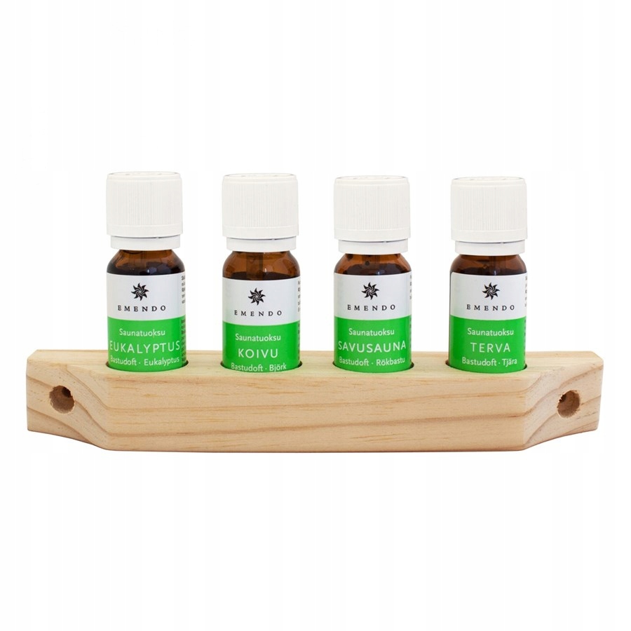 EMENDO SPA НАБІР ЕФІРНИХ ОЛІЙ ДЛЯ САУНИ 4X10 МЛ З ДЕРЕВ'ЯНОЮ ПІДСТАВКОЮ