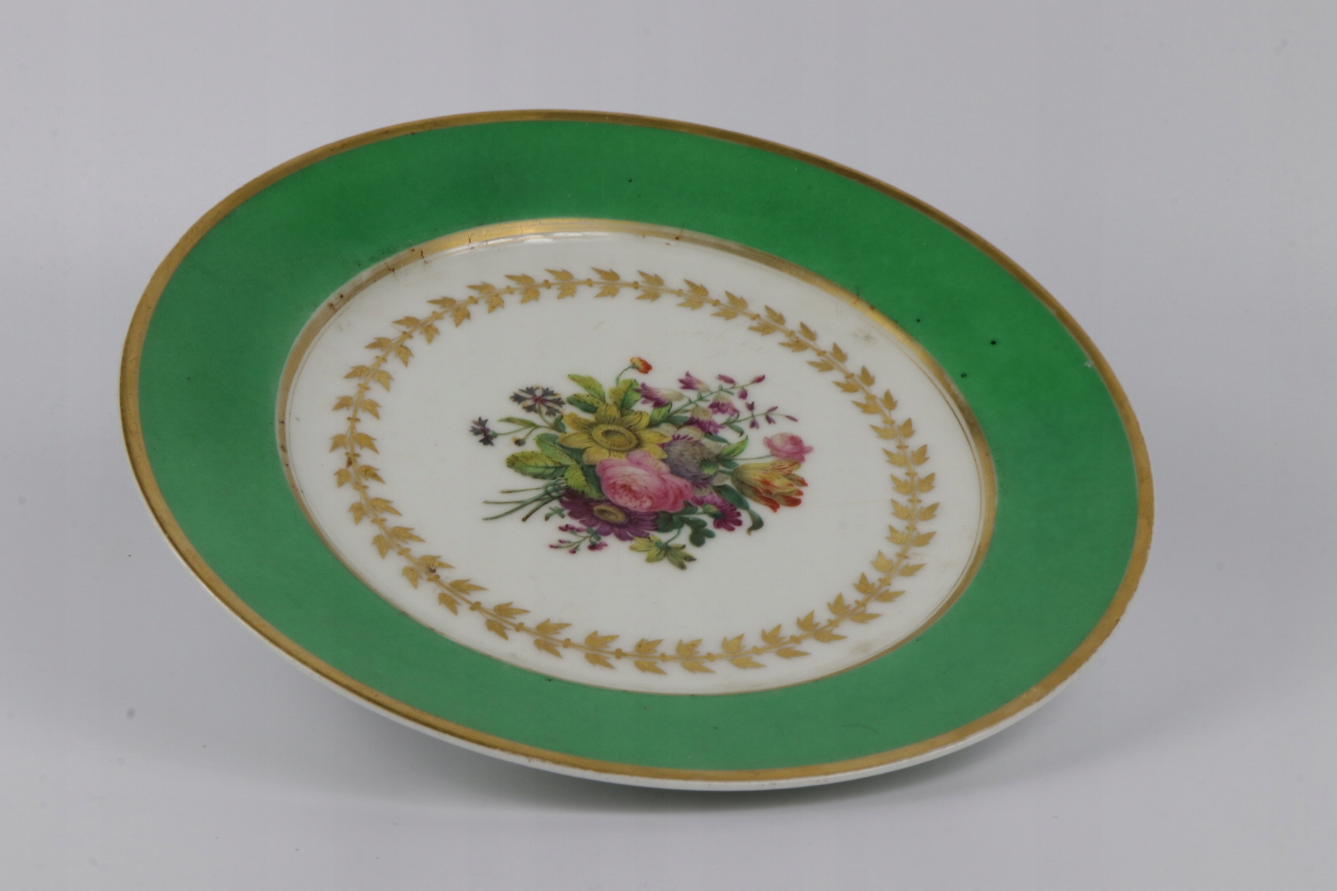 Фарфор, расписанный вручную и позолоченный. Красивый, очень изысканный и тщательно расписанный растительный орнамент. Край тарелки парижского зеленого цвета. Возможно, тарелка от лейбла Jacob Petit. На других аукционах я предлагаю еще две очень похожие тарелки, одна из них с подписью JP Jacob Petit