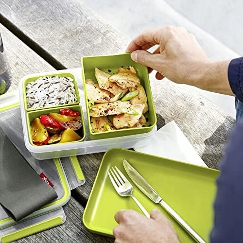 - свежесть, которую вы можете взять с собой: ящик для хранения продуктов с 3 вставками, отдельная тарелка, крышка для переноски, закуски и т. Д.
