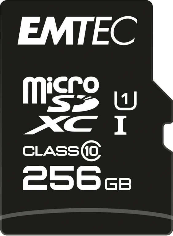 Emtec EliteGold. Емкость: 256 ГБ, Тип флэш-карты: MicroSDXC, Класс флэш-памяти: Класс 10, Тип внутренней памяти: UHS-I, Скорость чтения носителя: 90 МБ/с, Скорость записи носителя: 20 МБ/с, Класс скорости: Класс 1 (U1). Цвет товара: Черный