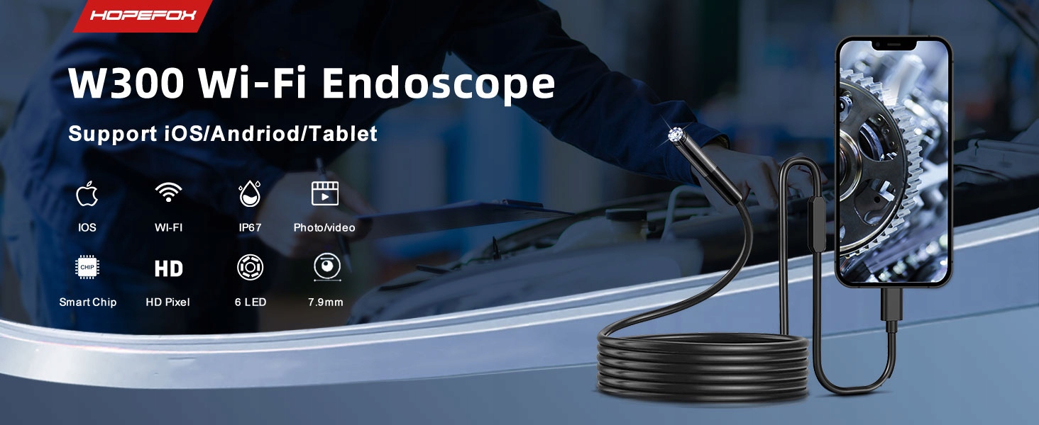 W300 — эндоскоп для смартфонов с HD-камерой. Устройство питается от подключенного мобильного устройства. После подключения к мобильному устройству изделие передает сигнал Wi-Fi и отображает изображение с камеры в приложении. W300 поддерживает фото и видео. Изделие оснащено камерой высокого разрешения и дополнительным светодиодным освещением небольшого диаметра. Камера оснащена высокочувствительным чипом и может использоваться как при ярком, так и при темном освещении.