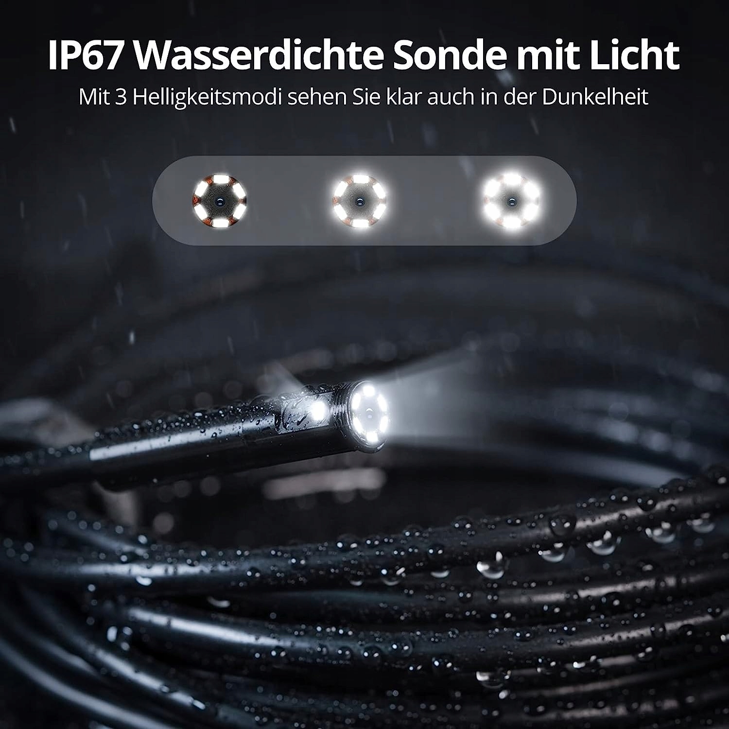 - Эндоскоп с ультра -тщательным зондом 7,9 мм -эндоскоп оснащен гибким и полу -реличным кабелем с объективом 7,9 мм, который может быть расширен до трудностей для особых мест для специальных цепей. Камера имеет меньший диаметр, что облегчает достижение узкого канала. Водонепроницаемый дизайн IP67 поддерживает 1 метр воды под водой. В идеале подходит для проверки каналов и дренажных труб