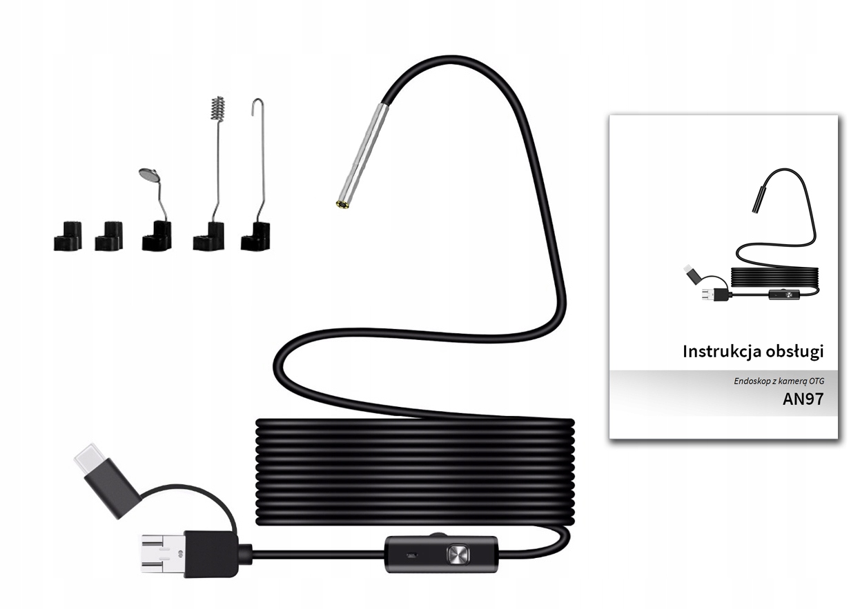 Устройство оснащено жестким кабелем длиной 5 м, который позволяет проверьте труднодоступные места. Диаметр камеры составляет 3,9 мм.