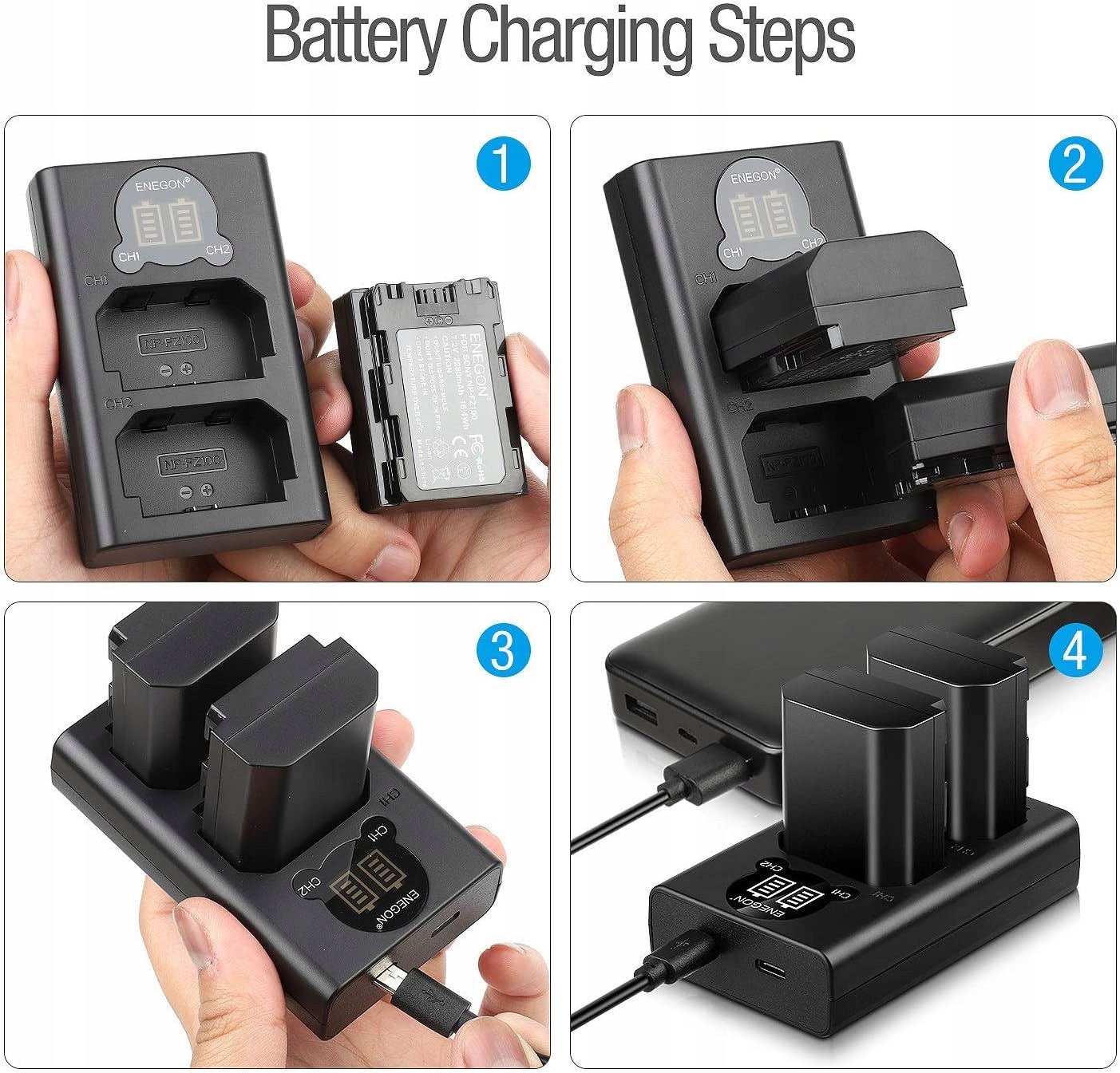 Комплект зарядного устройства ENEGON NP-FZ100, 2 запасных аккумулятора емкостью 2280 мАч с зарядным устройством с двойным ЖК-дисплеем типа C для Sony NP-FZ100, Sony a6600, a1, Alpha 9, A9, Alpha 9R, A9R, Alpha 9S, A7RIII, A7R3, a7 III < /h1>