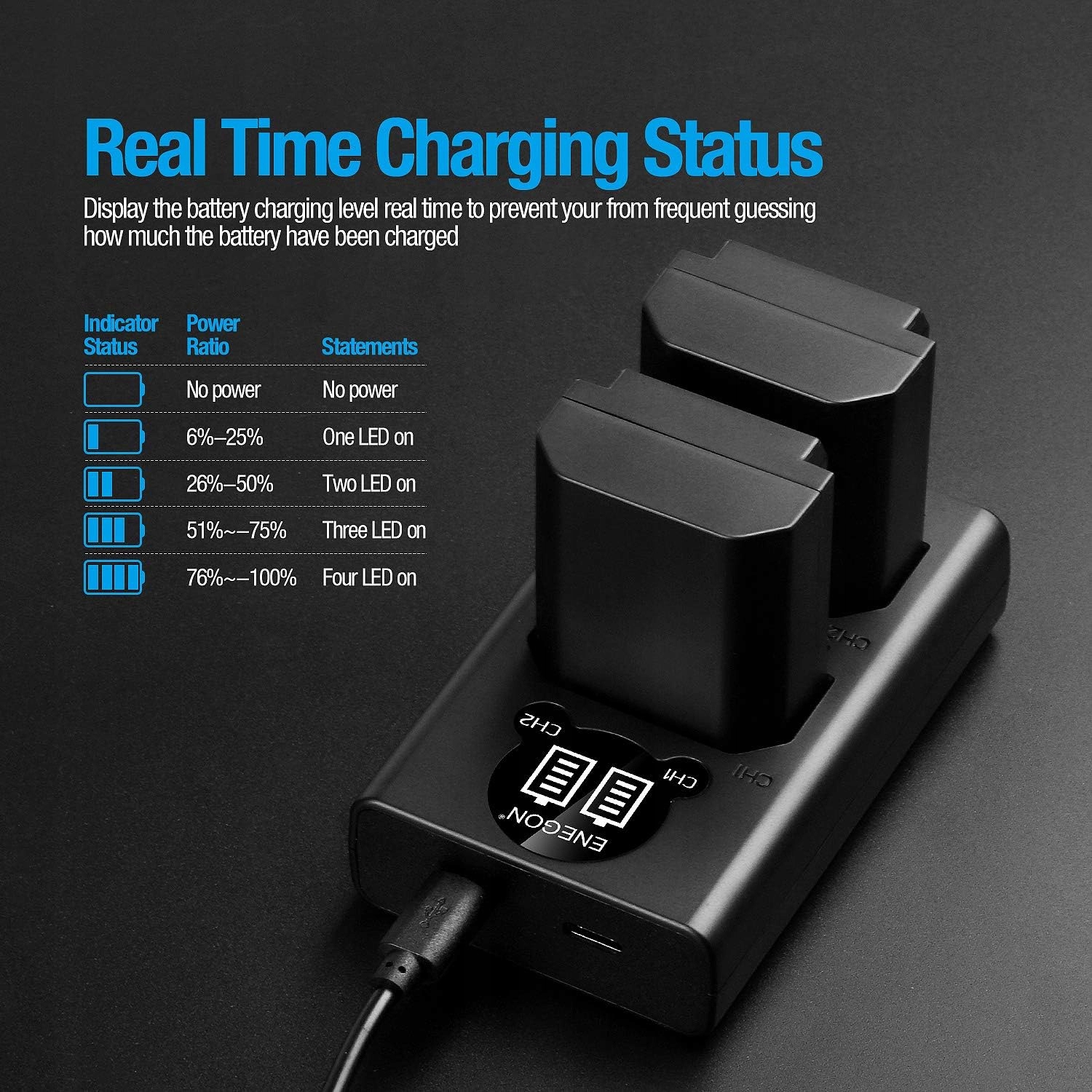 - 【Отображение состояния зарядки в реальном времени】Умное светодиодное зарядное устройство отображает уровень заряда батареи в режиме реального времени, чтобы предотвратить частые предположения о том, сколько заряда осталось. Он может заряжать две батареи одновременно или 1 батарею от любого источника питания USB.