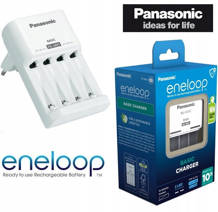 eneloop panasonic charger , предназначенная для зарядки батарей NIMH R6/AA и R03/AAA, зарядное устройство подключено непосредственно к розетке без использования кабеля. Зарядное устройство имеет два светодиода. Диоды сияют во время зарядки и выходят, когда защитный механизм выключает зарядное устройство.
