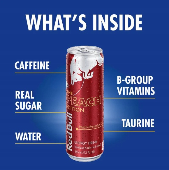 Энергетический напиток Red Bull Peach Edition подарит вам крылья, когда они вам понадобятся. Red Bull Peach Edition — слабогазированный энергетический напиток, содержащий смесь кофеина, таурина, витаминов группы B, настоящего сахара и воды, а также свежий вкус белого персика и нектарина. Red Bull, содержащий 160 калорий на банку, отлично подходит для любого случая. Если вы стремитесь к великим свершениям в течение дня, на работе, во время тренировок или во время игры, почему бы не открыть освежающую банку Red Bull? Пейте Red Bull прямо из банки или наслаждайтесь им в стакане со льдом. Новый Red Bull подарит вам энергию на все случаи жизни, будь то встреча с друзьями, просмотр матча или поездка. Будьте готовы к важным моментам с банкой Red Bull. Храните Red Bull при комнатной температуре или в холодильнике. Red Bull подарит вам крылья!