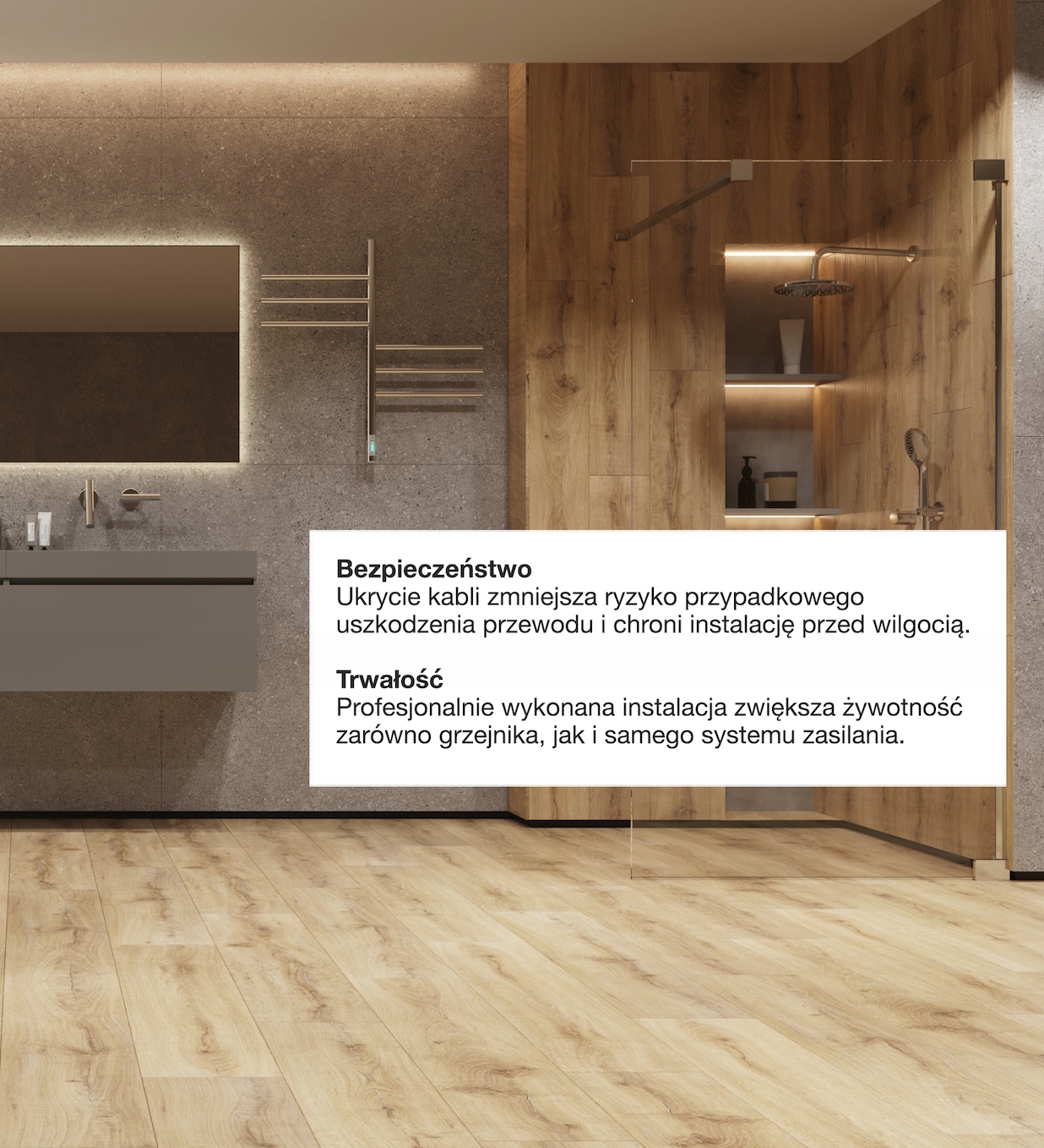 Благодаря современной технологии скрытого скрытого монтажа, вы установите электрическую сушилку для ванной комнаты Elna, без подъема питания, висящего снаружи, соединяя кабель, выступающий от радиатора прямо к кабелям электрической установки, оставляя стену. Это решение сводит к минимуму любые возможные опасные действия, связанные с использованием электрических устройств в комнатах с высоким уровнем влажности.