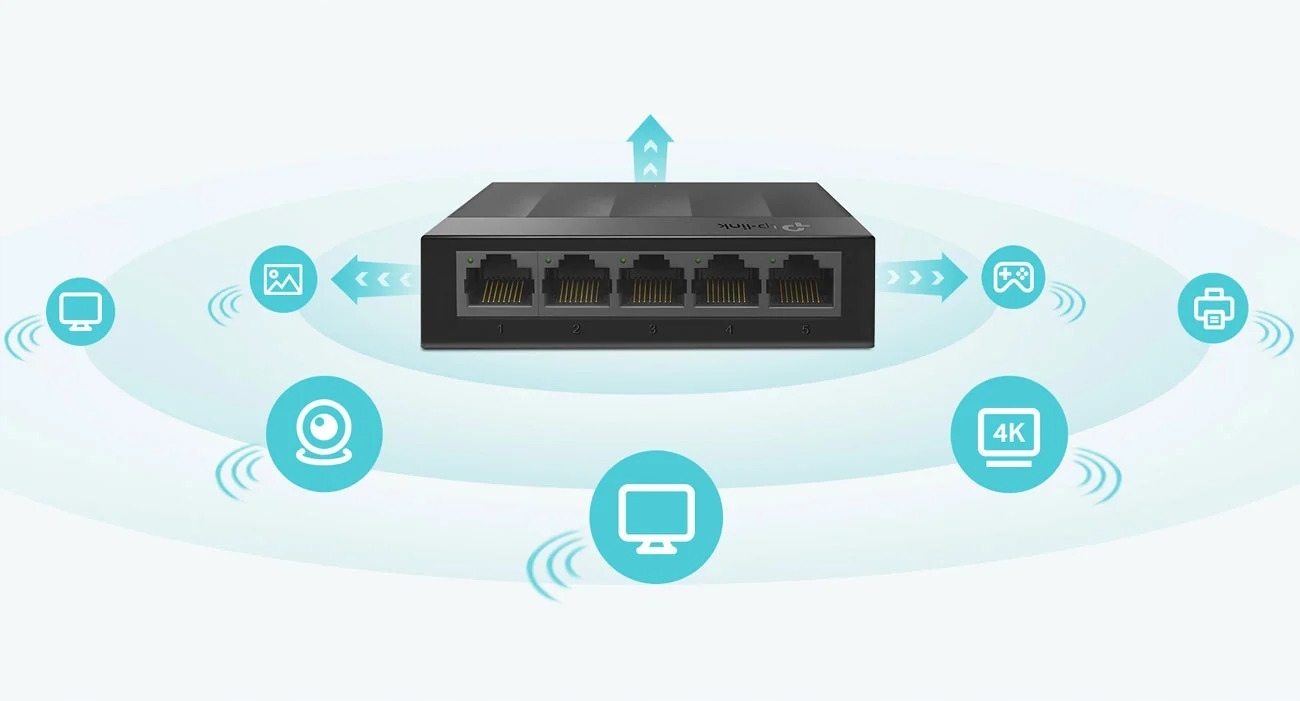 ✅ Неблокируемая архитектура и 5 портов 10/100/1000 Мбит/с обеспечивают быструю передачу тяжелых файлов, требующих высокой пропускной способности, без сбоев.
