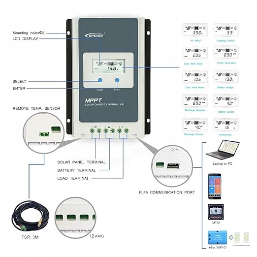 Солнечный контроллер с ЖК-дисплеем с подсветкой, поддержка дистанционного управления RJ45, RS485, мониторинг в реальном времени и настройка параметров для солнечных базовых станций, солнечных систем BTS, солнечных систем для дома солнечные уличные фонари и системы мониторинга солнечной энергии.