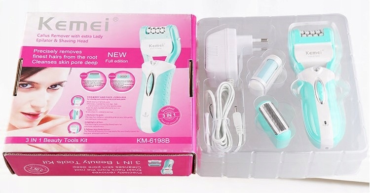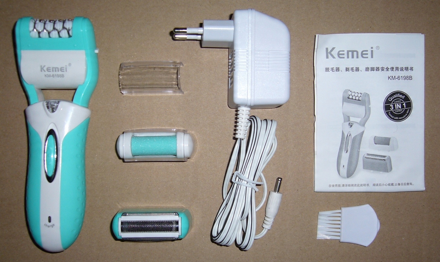 В комплект входят: ручка с аккумулятором, головка для эпиляции, бритвенная головка + триммер, головка с пилкой, блок питания, щеточка для чистки, инструкция на английском языке.