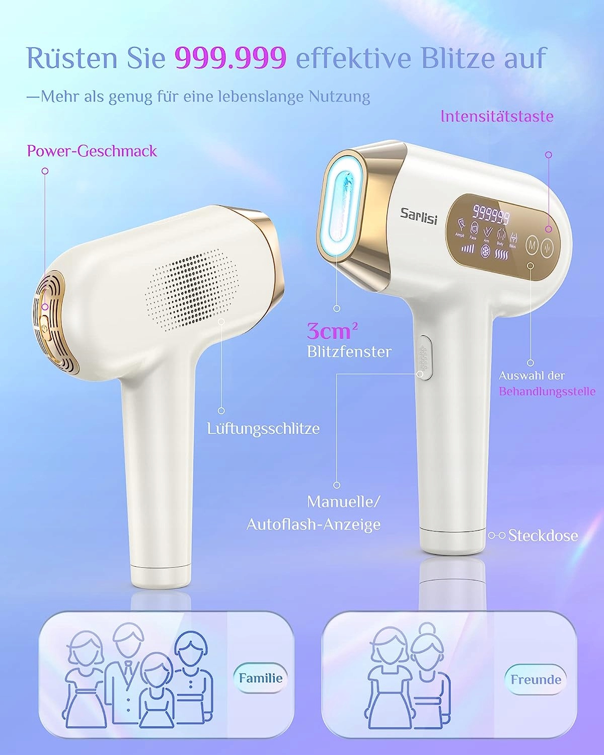 Освежает и безболезненно: благодаря уникальной технологии алмазного охлаждения, запатентованной Sarlisi, температура кожи во время эпиляции снижается до -10°C - 40°C, тем самым защищая кожу от ощущения жжения и термического повреждения кожи, вызванного высокими температурами. , а также удаляет волосы при низкой температуре, чтобы уменьшить нагрузку на кожу. деликатный процесс и особенно нежный для кожи.