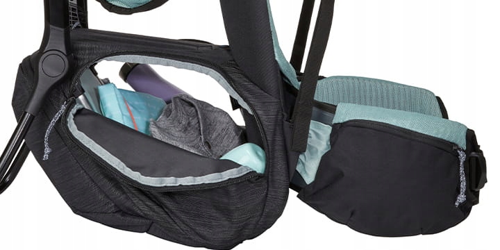В нижней части переноски имеется вместительный карман (22л) для аксессуаров, застегивающийся с обеих сторон, поэтому доступ к нему удобен при наличии рюкзака. На набедренном ремне расположен дополнительный небольшой карман, например для мобильного телефона.