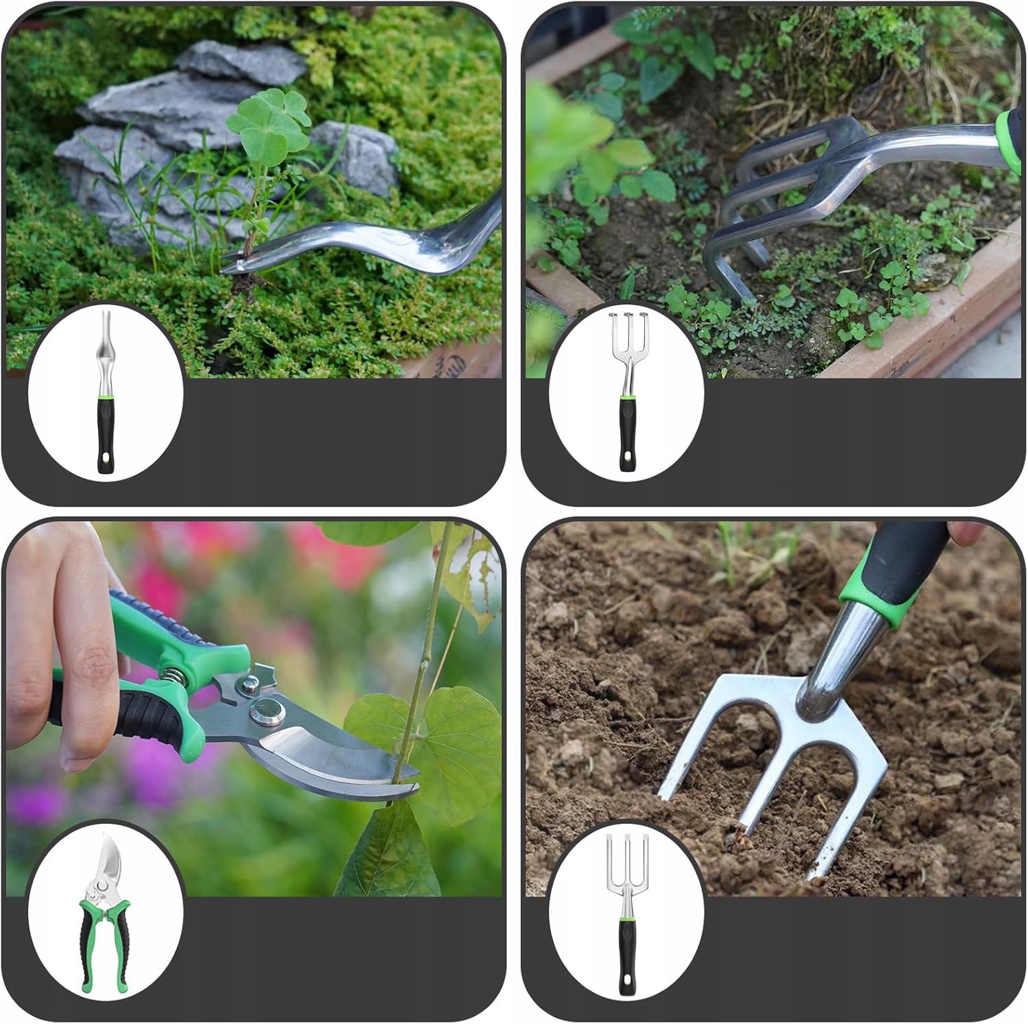 🌿 Полный набор из 11 садовых инструментов в практической сумке - идеально подходит для любителей садоводства! В комплект включает в себя: большой шпатель, шпатель со шкалой, трезубец, вилка, инструмент для удаления корней, садовые ножницы, поливная банка, сумка, перчатки, шнур и питательные вещества. коррозия.
