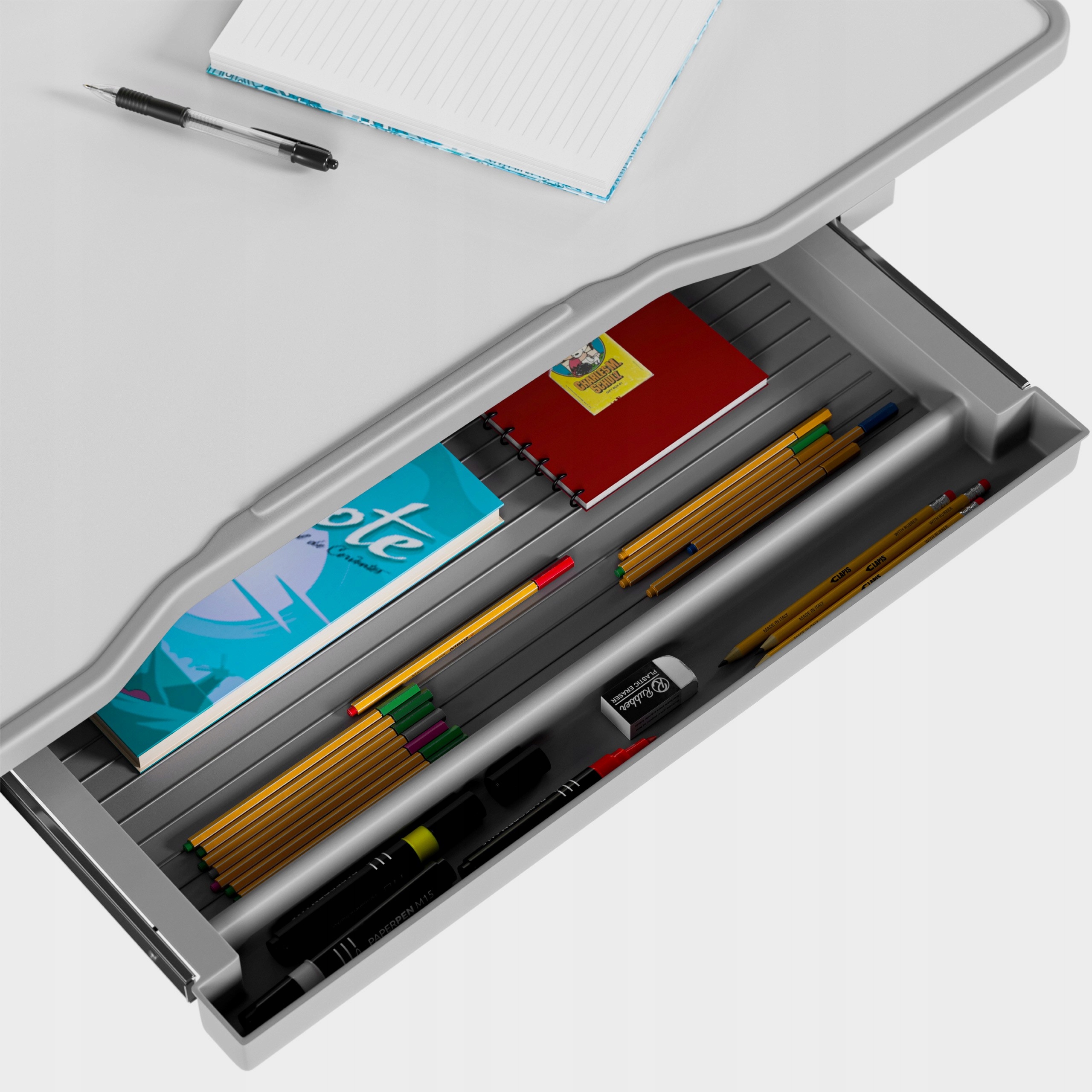 Столетняя столешница была покрыта специальным антирефлексивным покрытием, устраняя отражение света, благодаря которой ребенок может сосредоточиться на обучении без чрезмерных нарушений зрения. Чистое и упорядоченное рабочее пространство