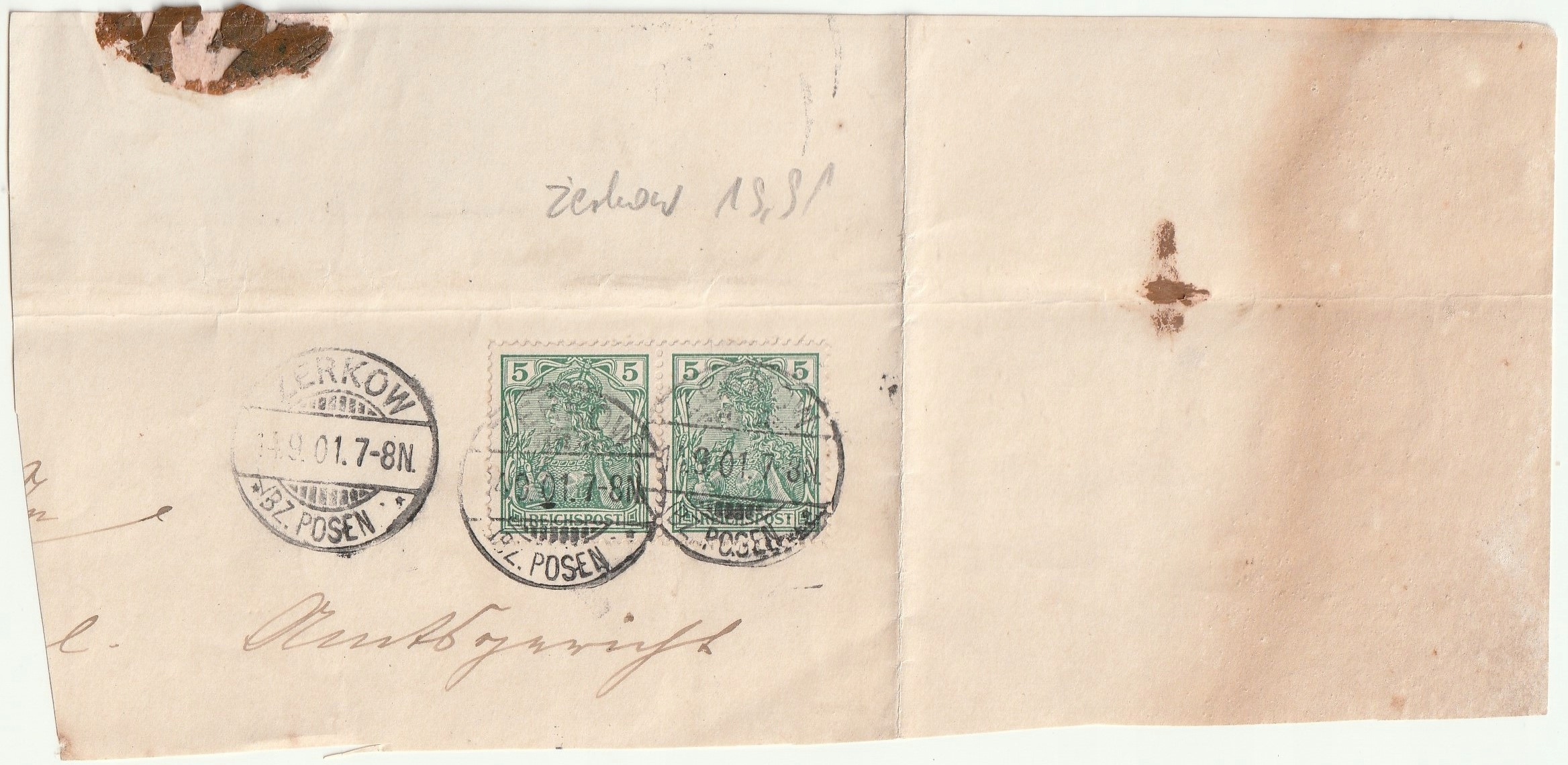 ЖЕРКУВ (Яроцинский район). Лист бумаги с двумя почтовыми марками и тремя марками 1901 года - почтовое отделение в Жеркуве, остатки старой переписки, следы сургучной печати; сложенный лист; размеры: ок. 113х93 мм.