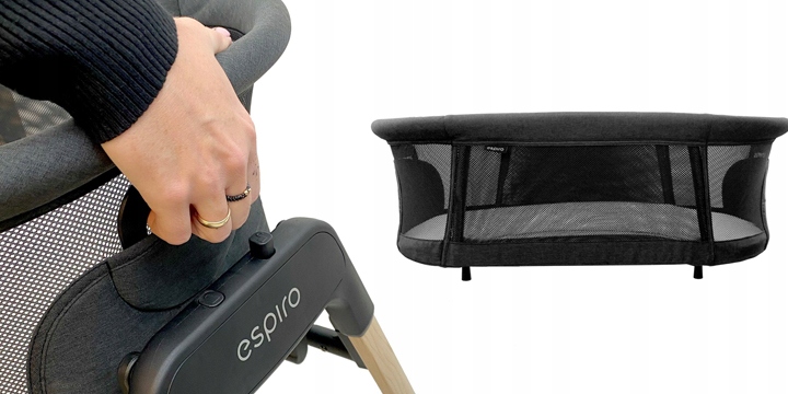 Сетчатые стенки кроватки Espiro Tully позволяют воздуху проникать в гондолу, поэтому ваш ребенок может свободно дышать.