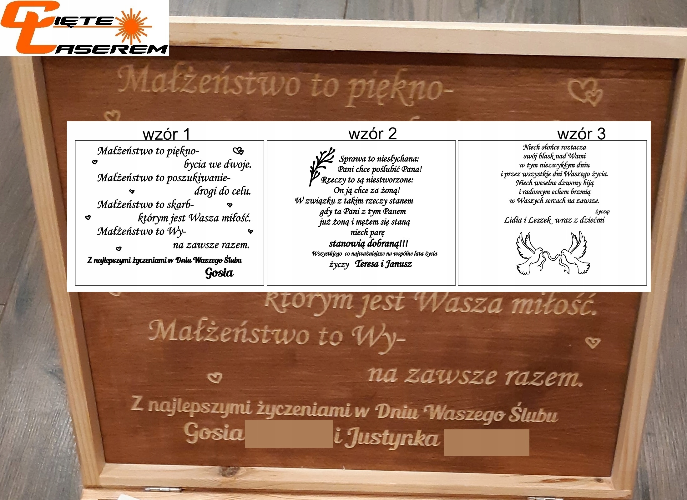 Внутри коробки находится табличка с лазерной гравировкой с пожеланиями молодоженам.