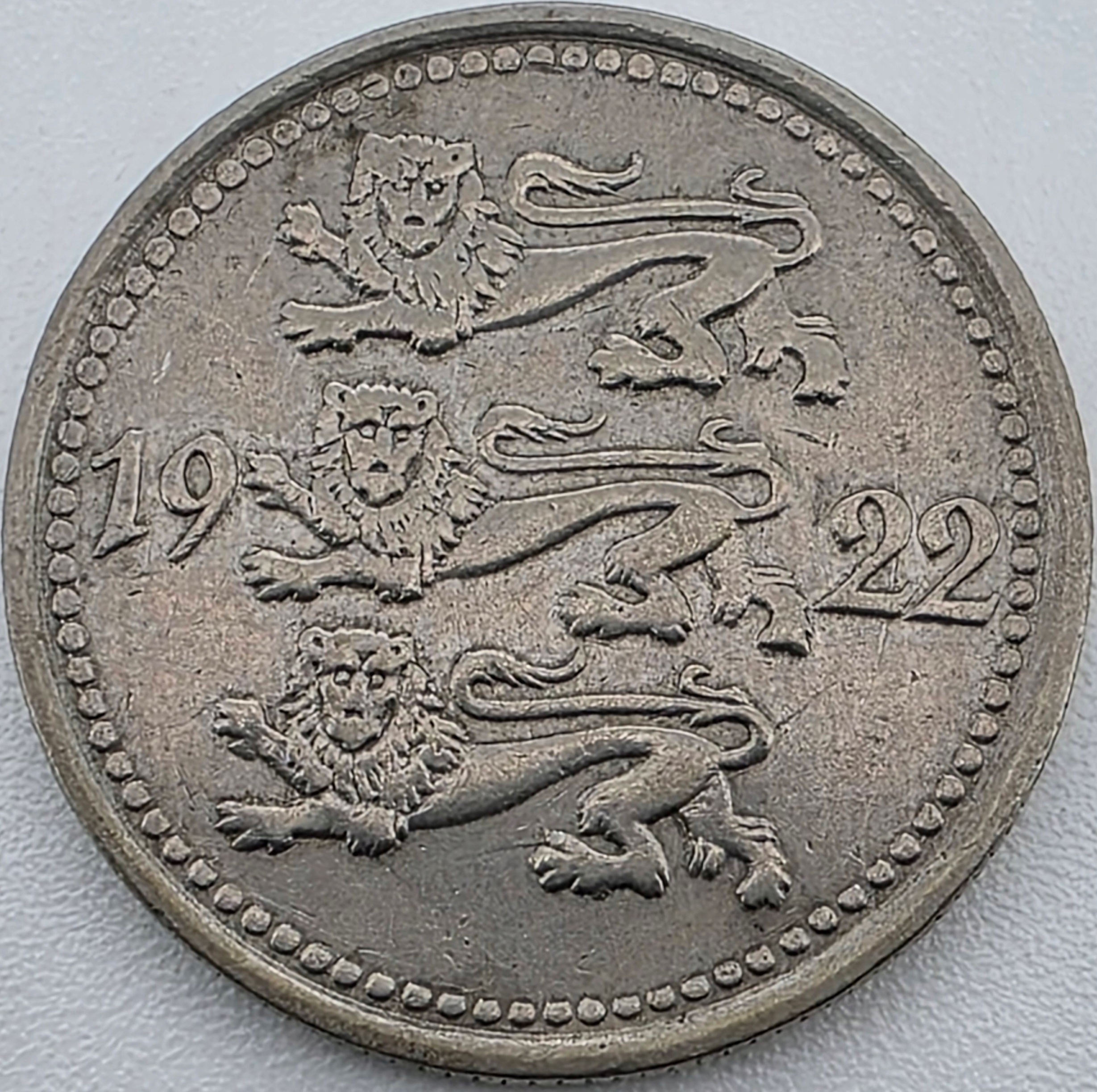 Три льва на гербе Эстонии, по бокам дата чеканки: 19 – 22