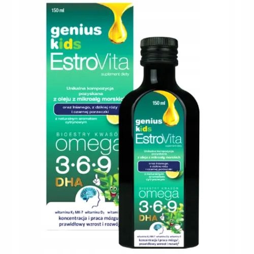 EstroVita Genius Kids — пищевая добавка, предназначенная для детей старше 3 лет. Изготовлен из уникальной композиции масел (микроводорослей, льна, черной смородины, шиповника). Он содержит уникальную комбинацию двух форм кислот омега-3 (АЛК и ДГК). Содержащаяся в препарате докозагексаеновая кислота DHA, полученная из масла микроводорослей, способствует правильному функционированию мозга и развитию организма. Наличие масла шиповника и розмарина поддерживает иммунную систему и естественные защитные силы организма.