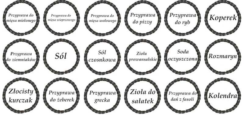 На нашем аукционе предлагается 142 наклейки с названиями специй за 11,99 злотых, тогда как на других аукционах такой набор стоит 25 злотых. Если интересующие вас специи не включены в список, посетите другой наш аукцион, где мы предлагаем 200 наклеек с дополнительным количеством специй.
