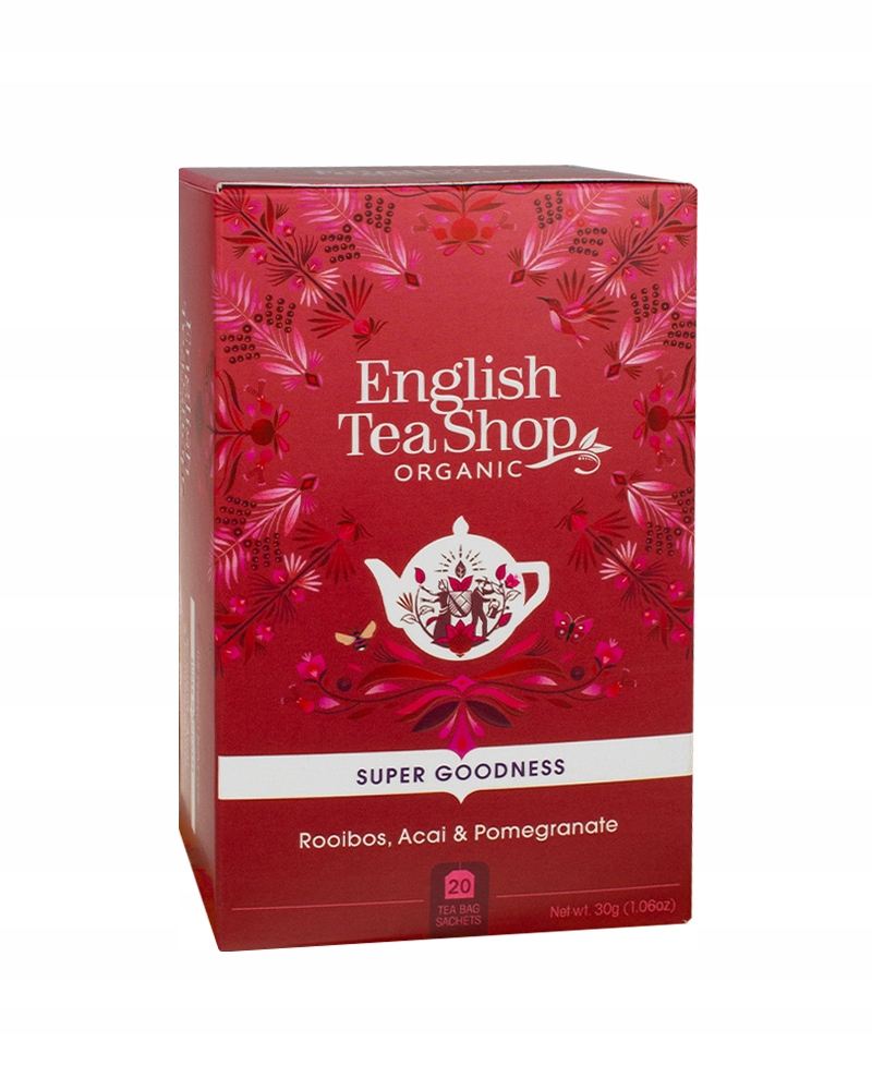 English Tea Shop Rooibos Acai Pomegranate — отличное предложение от известного английского чайного магазина. Он создан на основе экологических ингредиентов: южноафриканского ройбуша, ханибуса и гибискуса с добавлением граната, малины и ягод асаи. Он подкупает богатством ароматов, свежестью и сладостью. Идеально подходит как для теплого, так и для холодного варианта.