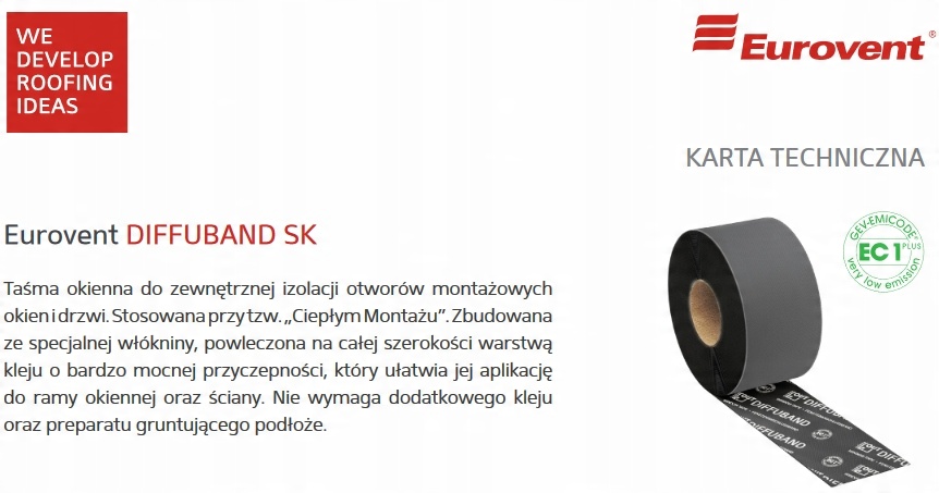 Eurovent® DIFFUBAND SK паропроницаемая оконная лента для наружной изоляции монтажных отверстий в окнах, жалюзи и дверях с использованием т.н. «Теплое собрание». Изготавливается из специального нетканого полотна, покрытого с одной стороны по всей ширине слоем высокоадгезионного клея, что облегчает его приклеивание к оконной раме или стене.
