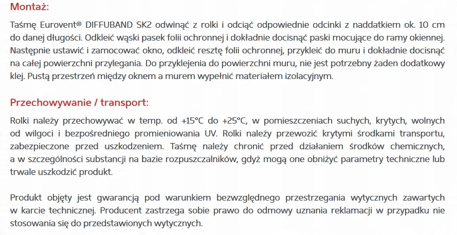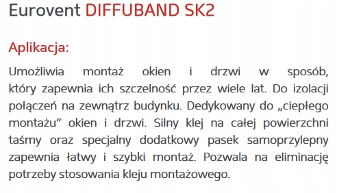 Eurovent® DIFFUBAND SK2 паропроницаемая оконная лента для наружной изоляции монтажных отверстий в окнах, жалюзи и дверях с использованием т.н. «Теплое собрание». Изготовлен из специального нетканого материала, покрытого с одной стороны по всей ширине слоем высокоадгезионного клея, что облегчает его приклеивание к оконной раме или стене. Лента дополнена дополнительной клейкой полосой шириной 20 мм с другой стороны, что облегчает ее приклеивание к оконной раме.