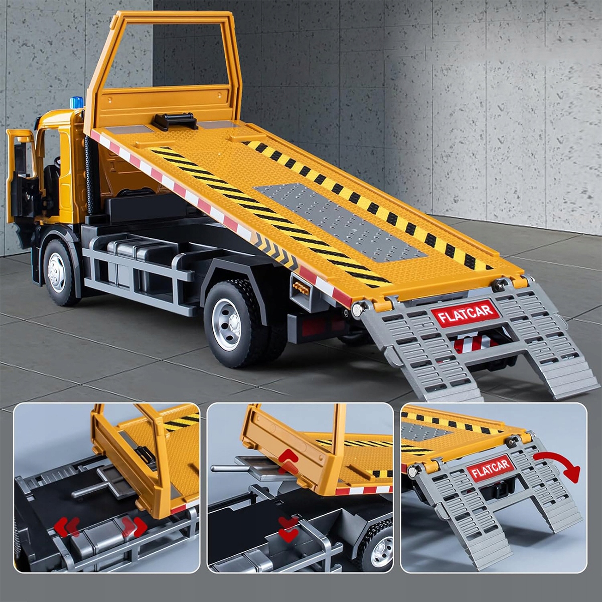 ✔️Полнофункциональный эвакуатор: когда ваш маленький любитель строительства получит этот эвакуатор, его глаза загорятся радостью. Сдвижная, наклоняемая платформа и складная задняя дверь позволяют легко транспортировать спасенные автомобили к эвакуатору, как настоящий эвакуатор, предназначенный для спасательных операций.