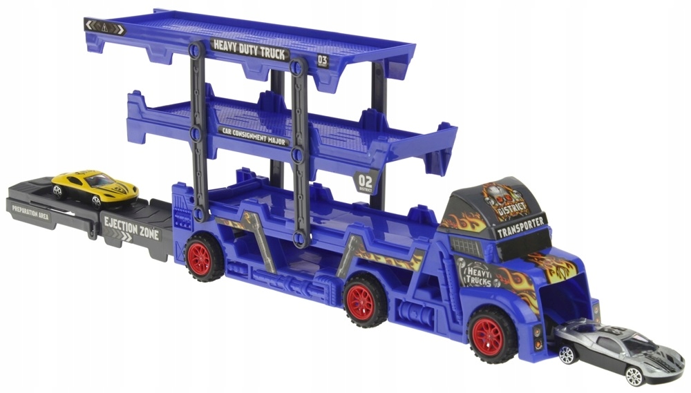 Грузовик с прицепом для перевозки техники – незаменимая вещь для каждого маленького коллекционера мощных автомобилей и других транспортных средств. Эвакуатор имеет 3 уровня, предназначенные для безопасной перевозки и хранения игрушечных машинок, благодаря чему ваш ребенок не потеряет ни одной ценной машинки и сможет перевозить их по гоночным трассам по всему миру. Также у грузовика есть пусковая установка для автомобиля, просто разложите кузов грузовика и всё! Чтобы запустить машину, нужно растянуть выступающий элемент гусеницы, поставить перед ней машину, нажать кнопку в форме буквы «П» в конце гусеницы и смотреть, как машина улетает! Трасса проходит через самый нижний уровень прицепа и выходит у крышки грузовика. Это идеальный механизм для получения преимущества в сумасшедшей гонке. Полуприцеп с тремя уровнями, предназначенный для перевозки автомобилей, можно поднять так, чтобы туда можно было легко разместить автомобили. Кроме того, в набор входит карта города, которую можно использовать в качестве гоночной трассы, красочные автомобили и дорожные знаки.