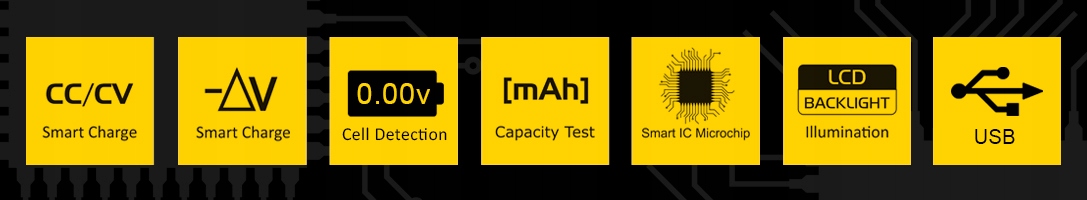 Литий-ионные и LiFePO4 аккумуляторы заряжаются методом CC/CV с оконечным током примерно 75 мА. Это обеспечивает полную безопасность и полную зарядку всех аккумуляторов, даже тех, которые вышли из строя или имеют низкую емкость. Зарядное устройство автоматически прекращает зарядку аккумуляторов, которые могут иметь различное напряжение. Ni-MH аккумуляторы заряжаются с использованием метода CC (постоянный ток) с очень точным обнаружением dV/PVD.