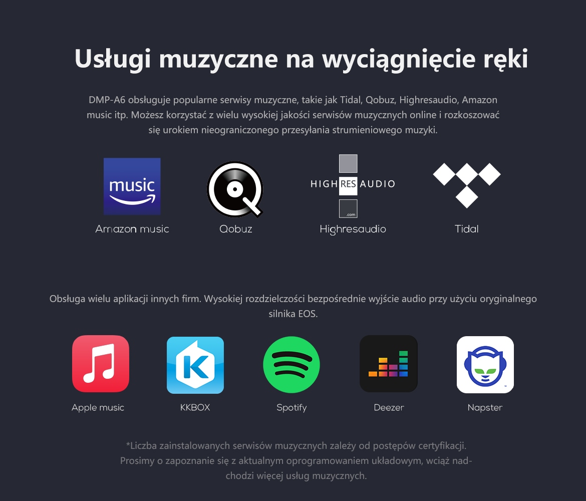 - Поддерживаемые музыкальные сервисы: Интернет-радио (TuneIn Radio и Audials Play), Tidal, Spotify, Qobuz, Highresaudio, Amazon, Apple Music, Deezer, Napster, KKBOX, WebDAV , UPnP.