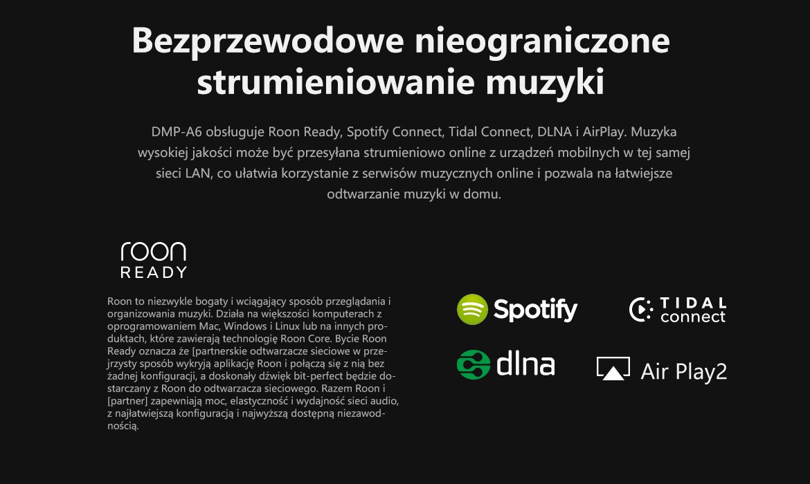 - Технологии потоковой передачи: Air Play, DLNA, Roon Ready, Spotify, Tidal Connect, Qobuz Connect и т. д.