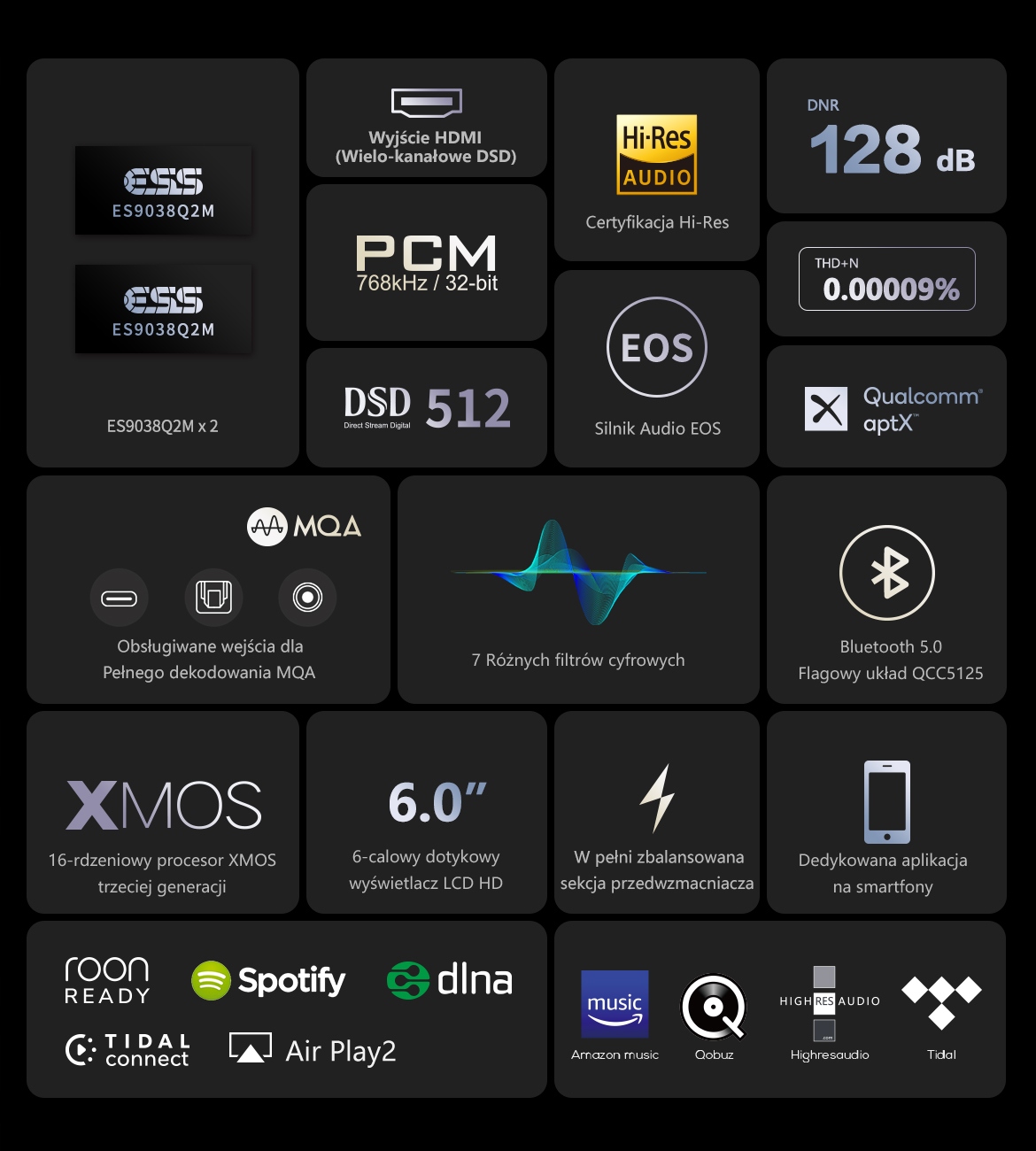 - Полная поддержка DSD512, PCM768KHz @ 32Bit и MQA.