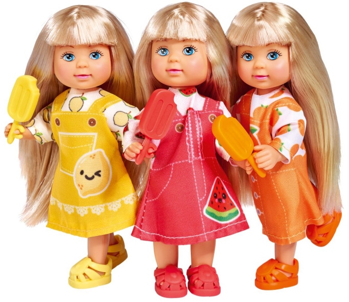 У кукол Эви длинные блестящие волосы, они одеты в платья с яркими фруктовыми принтами. У кукол на палочке разноцветное мороженое, вкус которого соответствует цвету одежды.