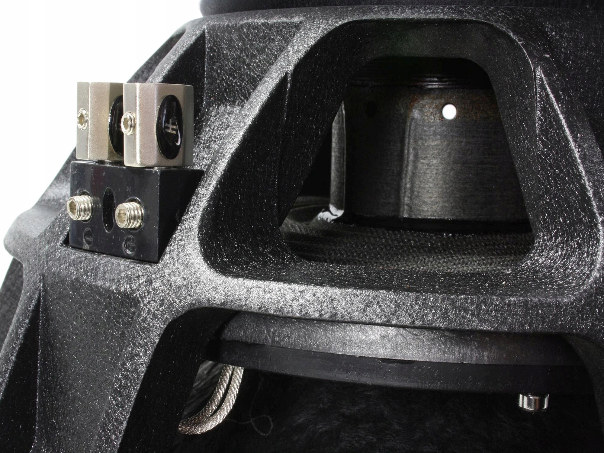 Акустики серии MXT.v2 имеют очень легкие и прочные диафрагмы, изготовленные из композита из натуральной целлюлозы, армированного углеродным волокном. Эта многослойная структура «сэндвич» имеет в своей структуре внутренние микровоздушные камеры, которые уменьшают вес, одновременно увеличивая толщину, жесткость и прочность, а также улучшают демпфирование на более низких частотах. В нижней части мембраны (под карбоновым пылезащитным чехлом) имеются отверстия, обеспечивающие свободный приток воздуха, что дополнительно способствует охлаждению змеевика. Хорошо сбалансированный компромисс между максимальной жесткостью и минимальным весом этой конструкции гарантирует сохранение высокой устойчивости диффузора в самые критические моменты при высоких уровнях звукового давления. Громкоговорители Excursion MXT.v2 имеют узкую, но высокую верхнюю подвесную складку из вспененной резины Rubatek, которая обеспечивает быстрые и чрезвычайно большие пиковые отклонения всей реальной поверхности диафрагмы. Верхний подвес был прочно приклеен, дополнительно пришит к конусу мембраны и дополнительно прижат к корзине литым алюминиевым кольцом с вырезанным лазером логотипом Excursion. В свою очередь нижняя подвеска состоит из двух отдельных 10-дюймовых дисков многослойной конструкции с двумя прижимными кольцами, прикрученных к прочной литой алюминиевой корзине. Очень жесткая и устойчивая корзина оснащена двумя прочными винтовыми разъемами, позволяющими подключать акустические кабели сечением до 4x8GA (4x8,5 мм2), которые опционально могут работать с двойными разъемами Hollywood Energetic HPST-8. Благодаря этому к каждому динамику можно подключить до 8 акустических кабелей (8х10 мм2). Эффективную и безаварийную передачу энергии от разъема к звуковой катушке обеспечивают двойные гибкие кабели толщиной 6 мм2 каждый, которые для повышения долговечности крепятся к складкам нижнего подвеса. Сабвуферы серии Excursion MXT.v2 оснащены 4-слойными высокотемпературными звуковыми катушками CCAR диаметром 3 дюйма и высотой 60 мм. Они были намотаны легким плоским алюминиевым проводом, покрытым черным теплопоглощающим покрытием, на легком алюминиевом каркасе с дополнительными вентиляционными отверстиями. Обмоточный провод в виде плоского стержня обеспечивает большую поверхность склеивания слоев обмотки катушки (более высокую механическую прочность) и имеет большую поверхность теплоотвода, что гарантирует более эффективное охлаждение катушки, тем самым увеличивая ее нагрузочную способность.