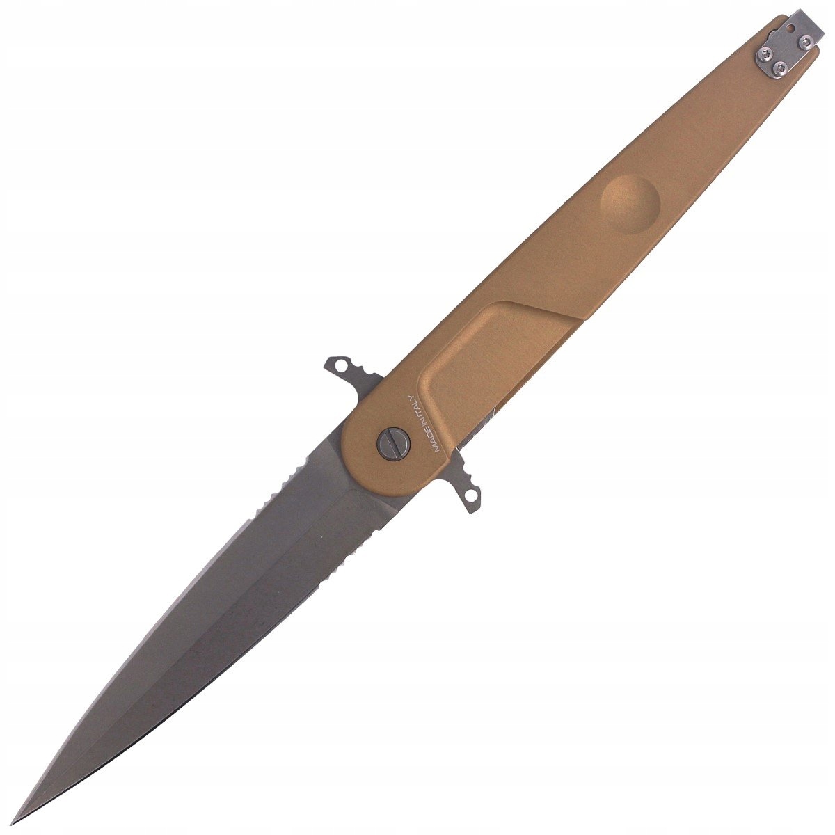 blade - стройный и чрезвычайно острый с профилем Dagger (кинжал) с симметричным лезвием. Стороны лезвия с короткой пилой для агрессивного разреза. Лезвие из резкости, произведенное в австрийских сталелитейных заводах böhler-wuddeholm, прочная, высокодюймовая нержавеющая сталь n690 с твердостью 58 HRC. Сгорание. Двустороннее гладкое лезвие plain была отмечена плоским разрезом (плоская шлифовка), которая обеспечивает прочность, превосходную режущую геометрию и экстремальную эффективность резки и проникновения. Твердый механизм Liner-Lock. Двусторонняя (двойная) стальная заречная jelec Защита руки и подает в покое для быстрого открытия лезвия.