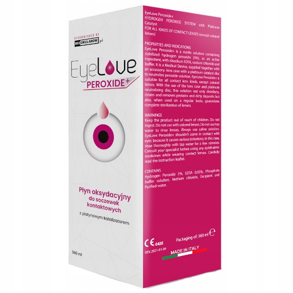 EyeLove Peraxis+ подходит для очистки всех типов контактных линз (кроме цветных). Это стерильный раствор, содержащий стабилизированную перекись водорода (3%) в качестве активного ингредиента, динатриевую соль ЭДТА и хлорид натрия.