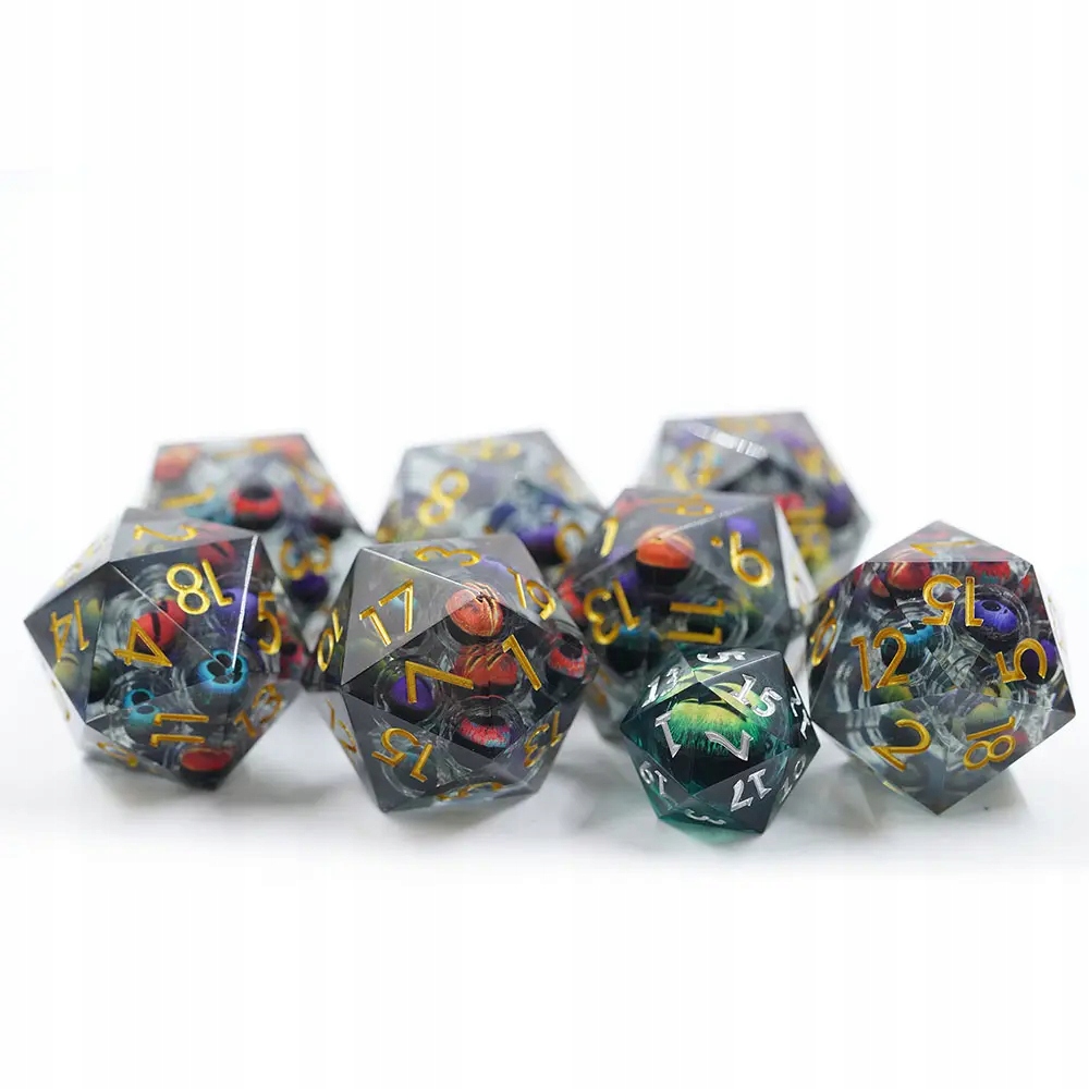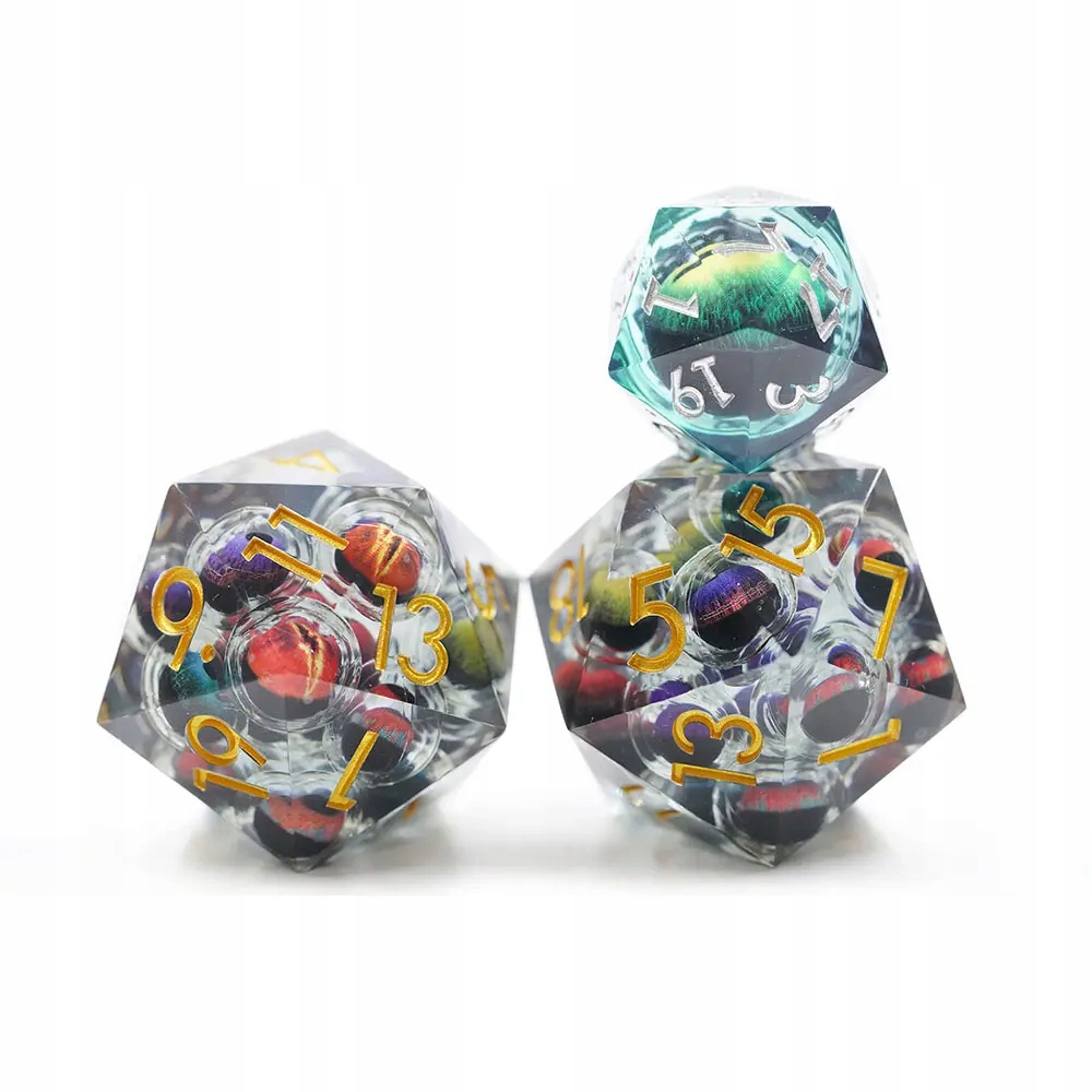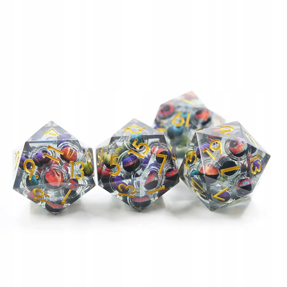 Кости D20, идеально подходящие для ролевой игры. Внутри куба плавают многочисленные глаза, свободно плавающие в жидком ядре, грозно глядящие вверх при каждом броске, словно сами бросая вызов судьбе.