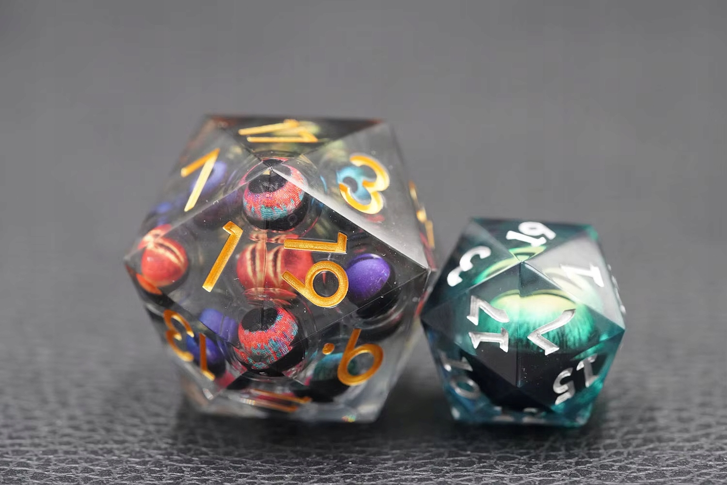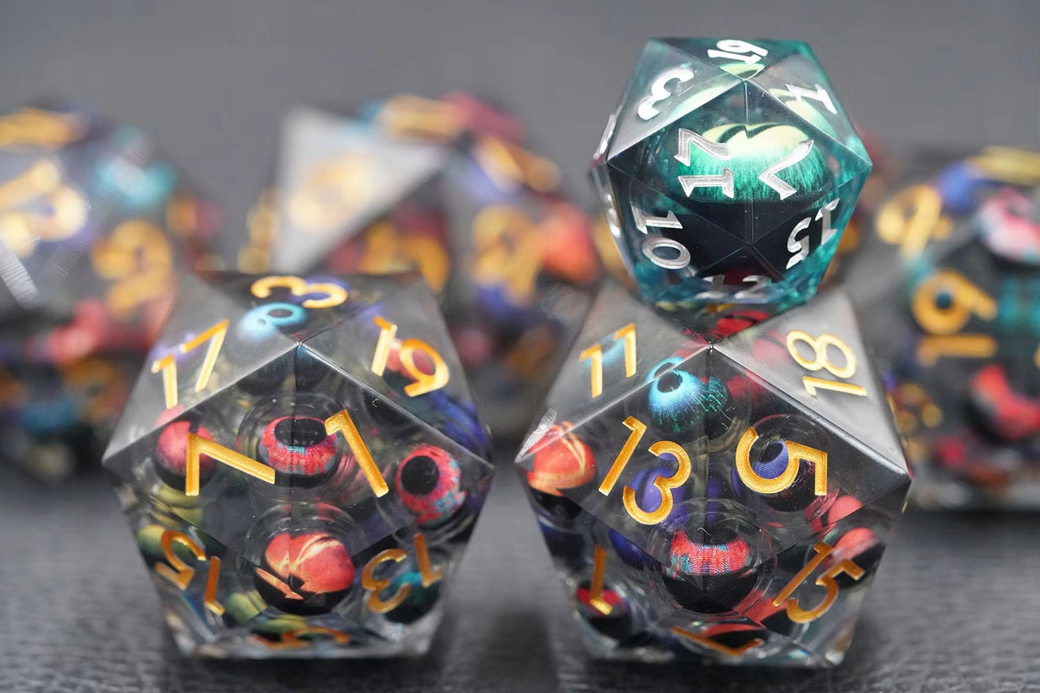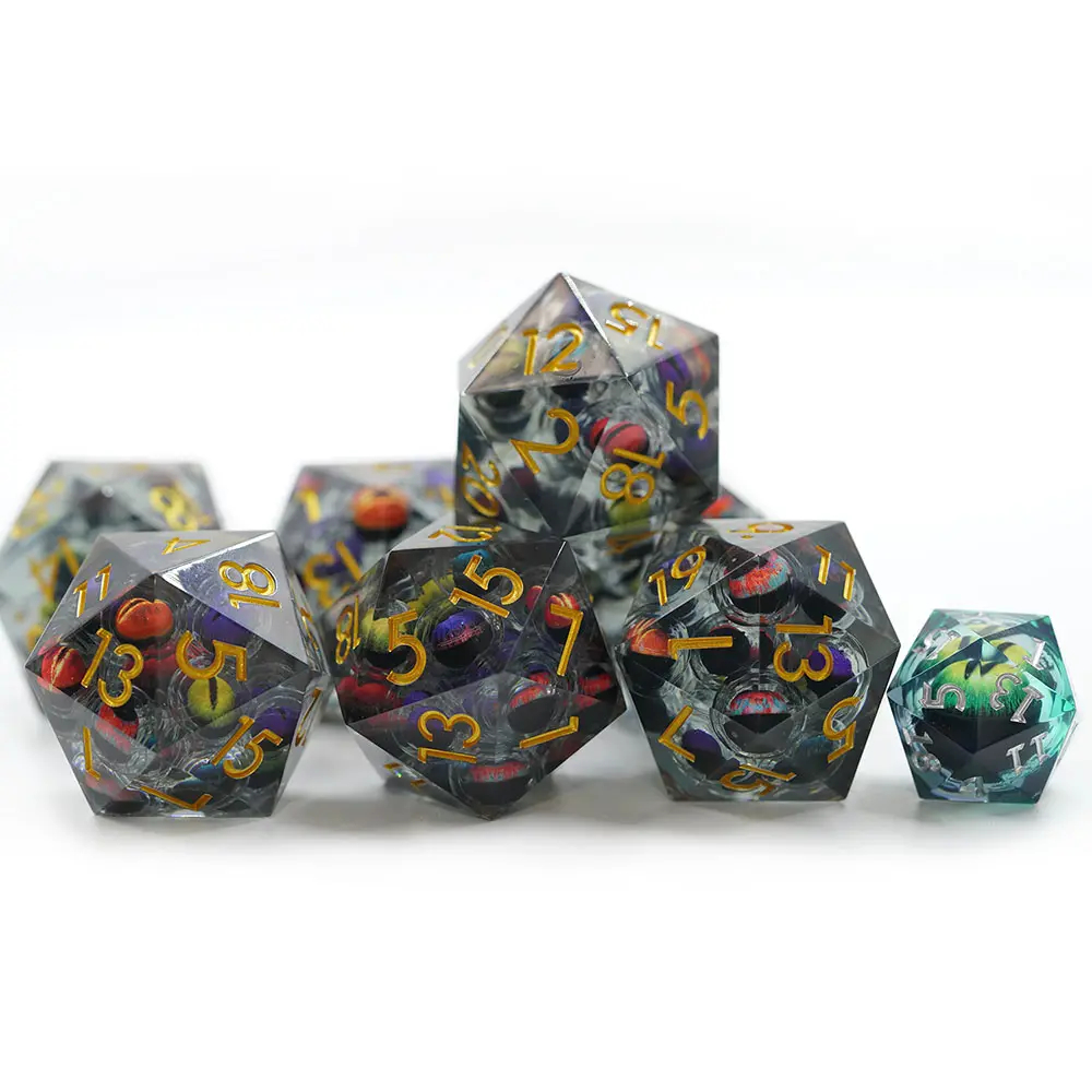Кости D20, идеально подходящие для ролевой игры. Внутри куба плавают многочисленные глаза, свободно плавающие в жидком ядре, грозно глядящие вверх при каждом броске, словно сами бросая вызов судьбе.