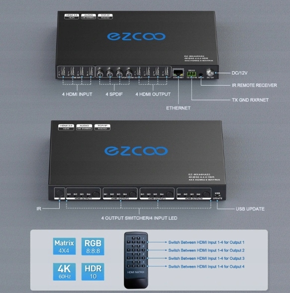 EZCOO 4K60 HDMI MATRIX 4X4 HDMI 2.0 MATRIX Переключатель