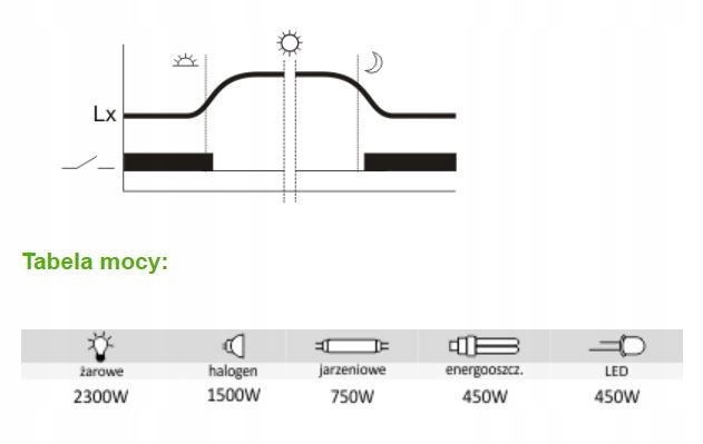 Сумеречный выключатель Разместите AWZ в месте с постоянным доступом естественного дневного света, который будет вызывать включение и выключение освещения с изменением его интенсивности. Время включения освещения может быть установлено пользователем с помощью потенциометра. Поворот в сторону «луны» — включится позже, поворот в сторону «солнца» — включится раньше. Сумеречный выключатель AWZ имеет систему, которая задерживает включение и выключение освещения, тем самым исключая влияние помех (например, молнии) на работу выключателя.