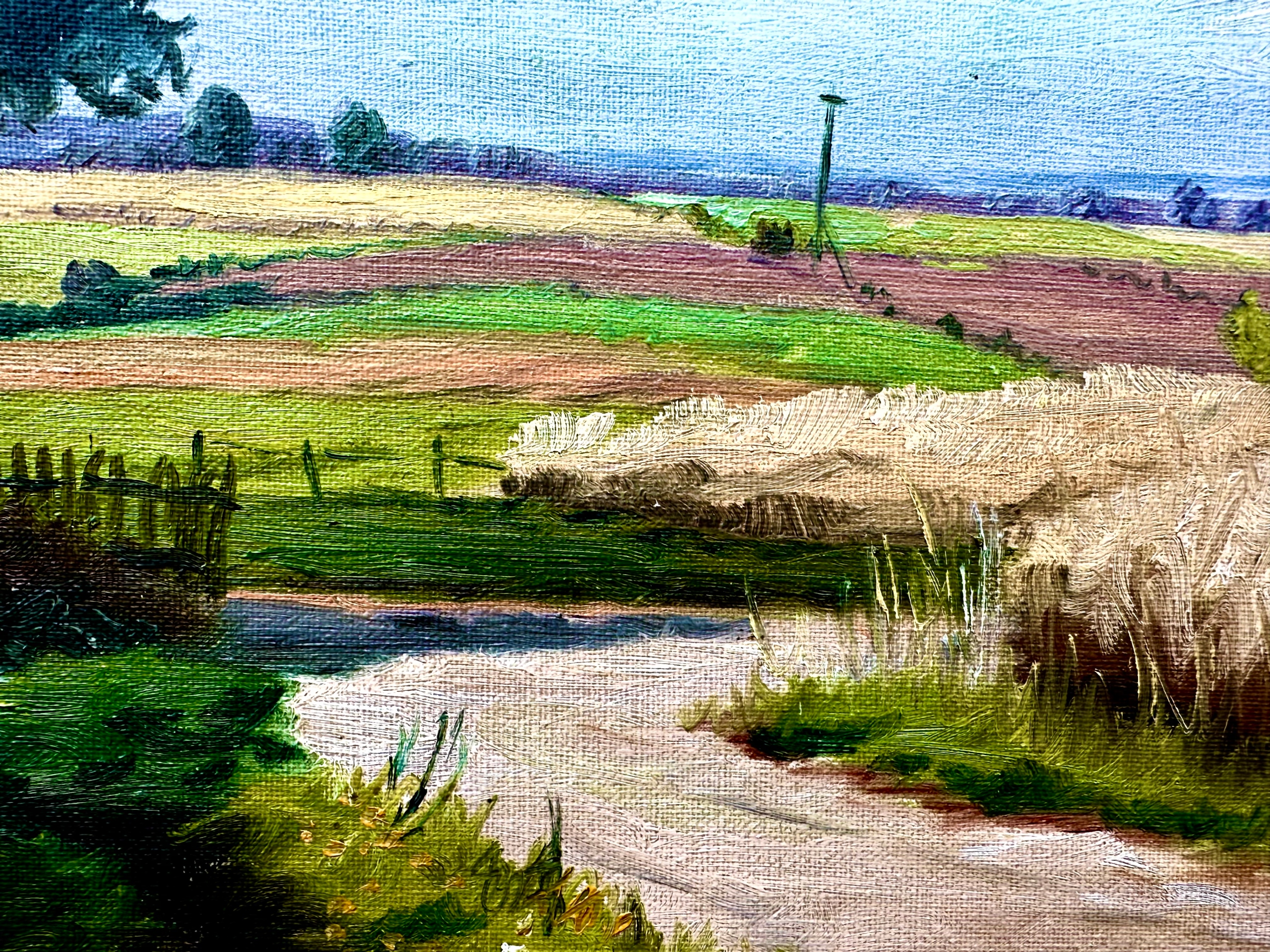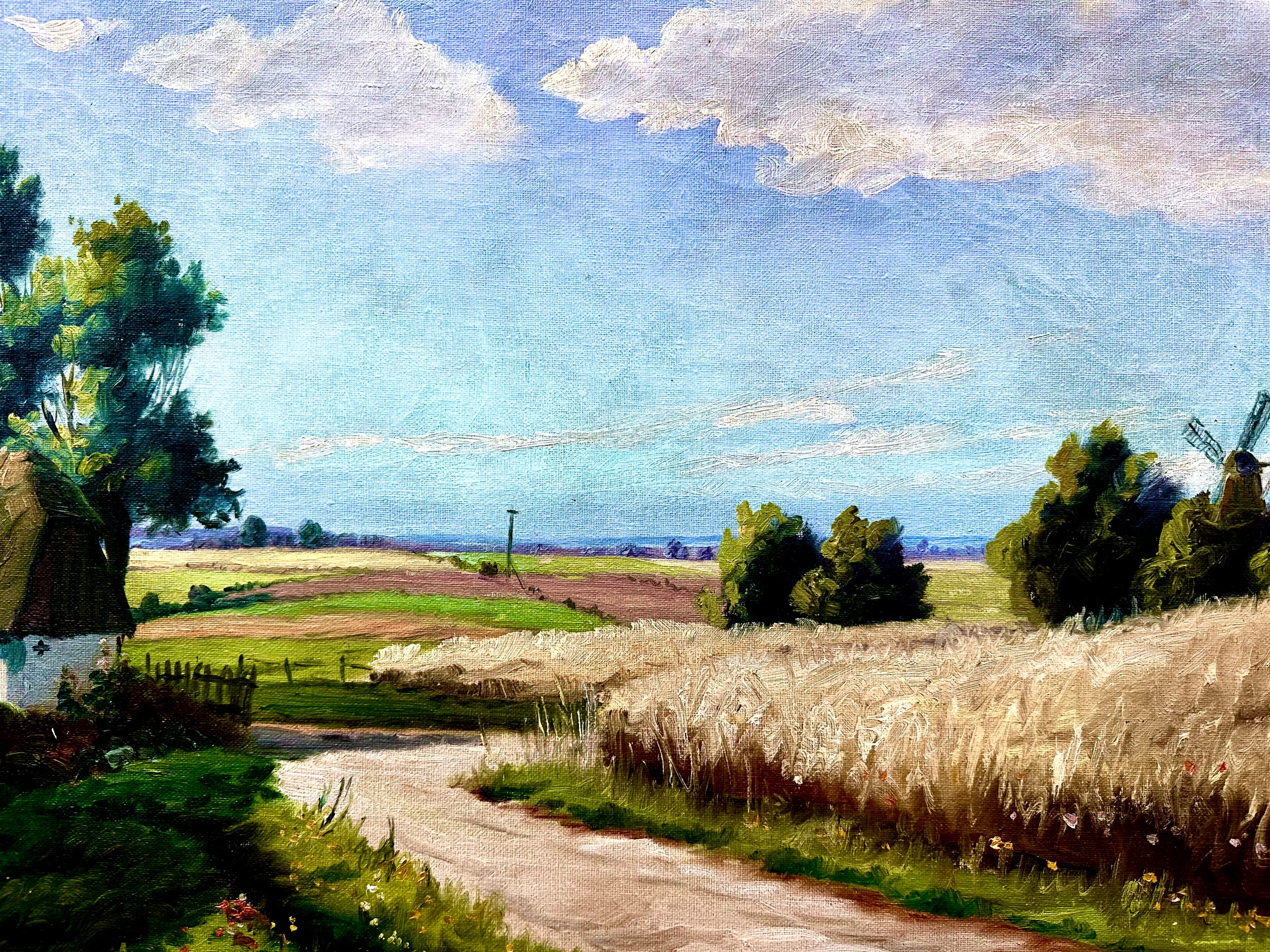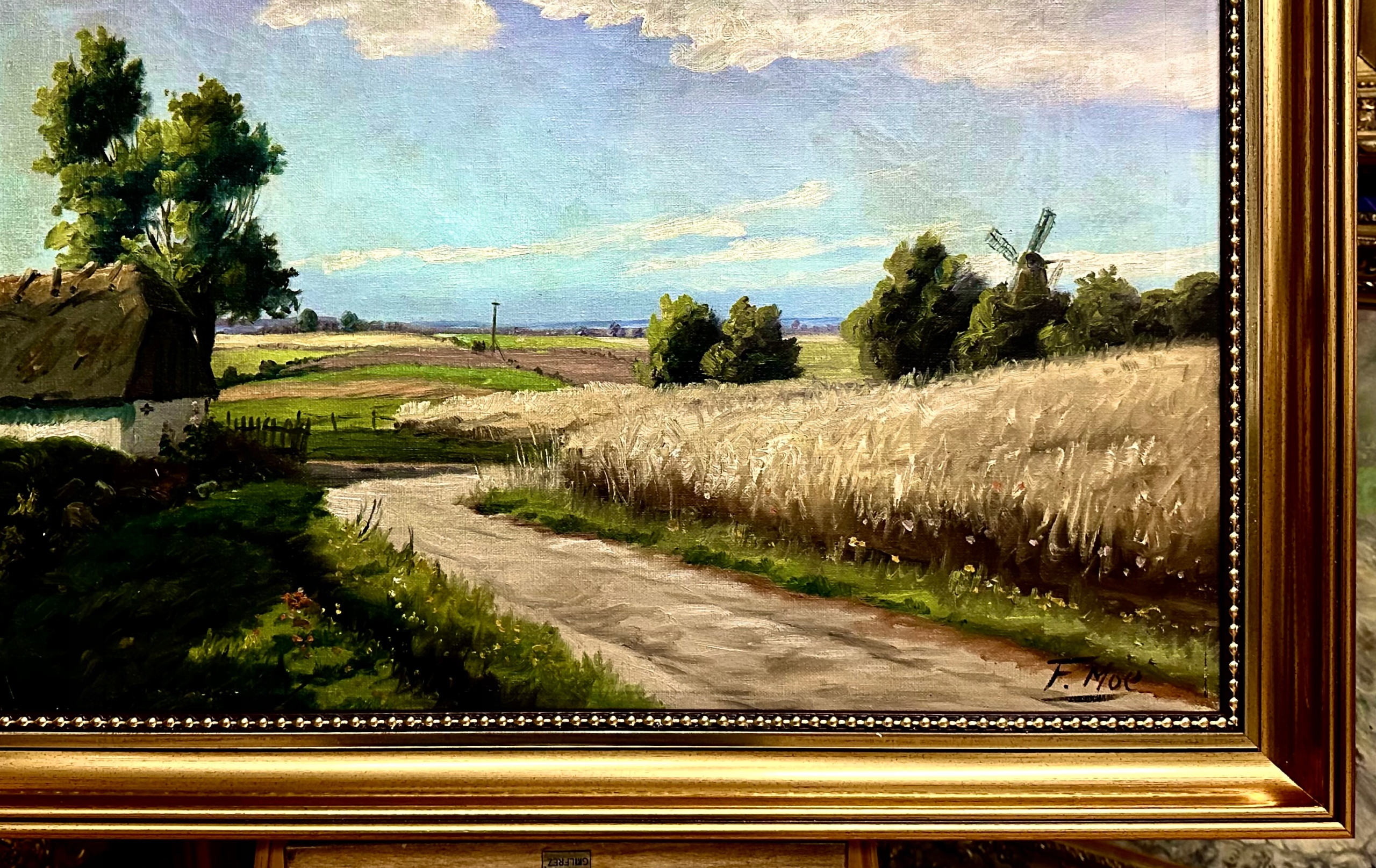 F. MOE - СІЛЬСЬКИЙ ПЕЙЗАЖ З ВІТРЯКОМ СЕРЕД ПОЛІВ, СТАРА ЦІННА КАРТИНА ТА РАМА