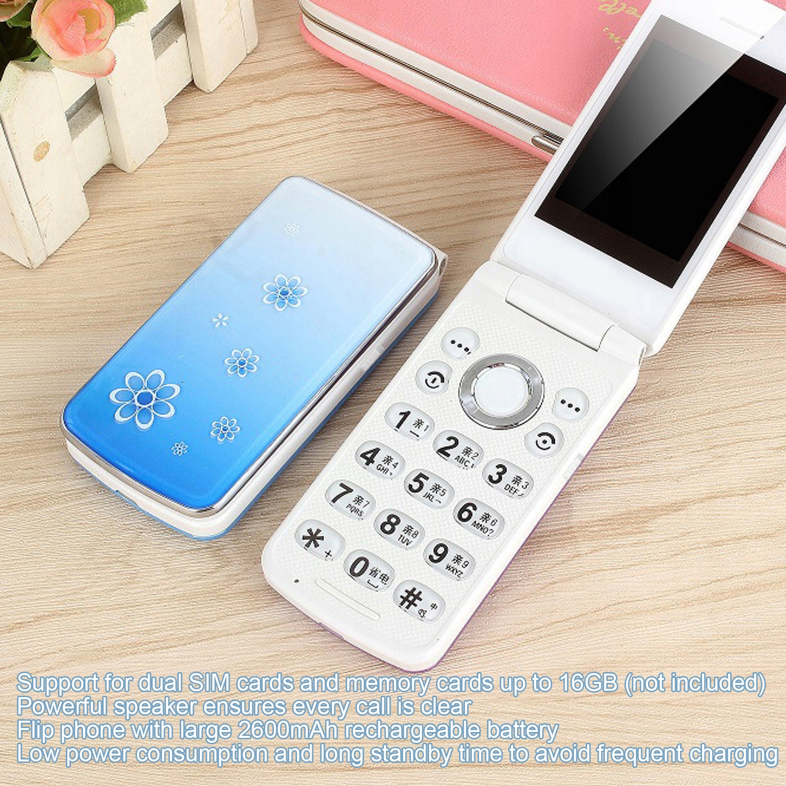 5. Долгое время готовности: флип -телефон оснащен большой батареей 2600 мАч с низким энергопотреблением и длительным временем готовности, чтобы избежать частых советов.