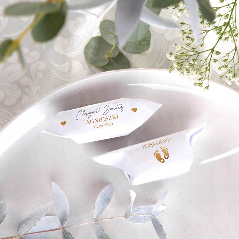 - помадки завернуты в белую бумагу, которая украшена именем ребенка, датой крещения, изображением золотых ножек и сердечек и надписью «Спасибо».