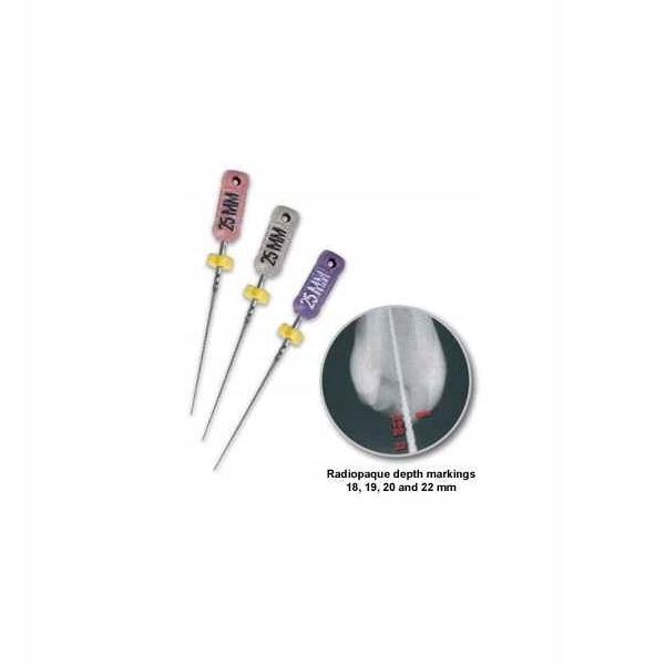 Ручные инструменты для очищающих каналов. Он имеет эргономичную ручку шнура. Файлы изготовлены из специальной, гибкой, лучшей стали, структура которой значительно увеличивает сопротивление переломам. Пассивный (прямо закончился) Верх позволяет вам безопасно вести инструмент в канале.