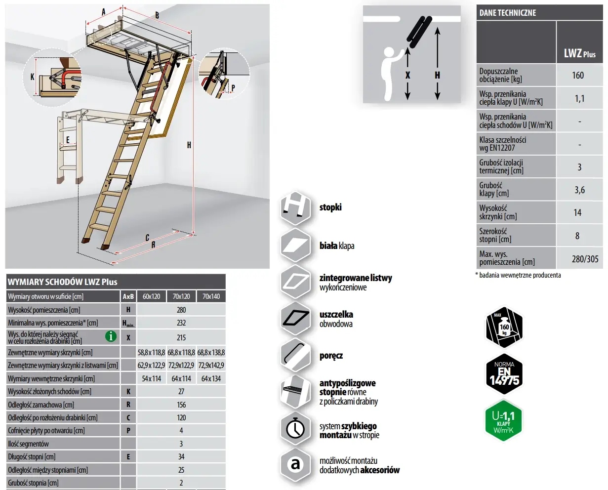 Fakro lwz lwz плюс лестницы Strych в 3 -сегментной версии производится в размерах 60x120, 70x120, 70x130, 70x140 - максимальная высота комнаты 280 см.
