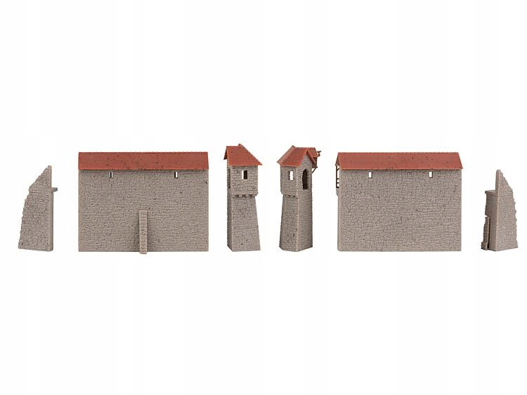 Две оборонительные башни, две части стены с крытым переходом + две руины для оформления старой городской стены. Возможна вариативная компоновка.
